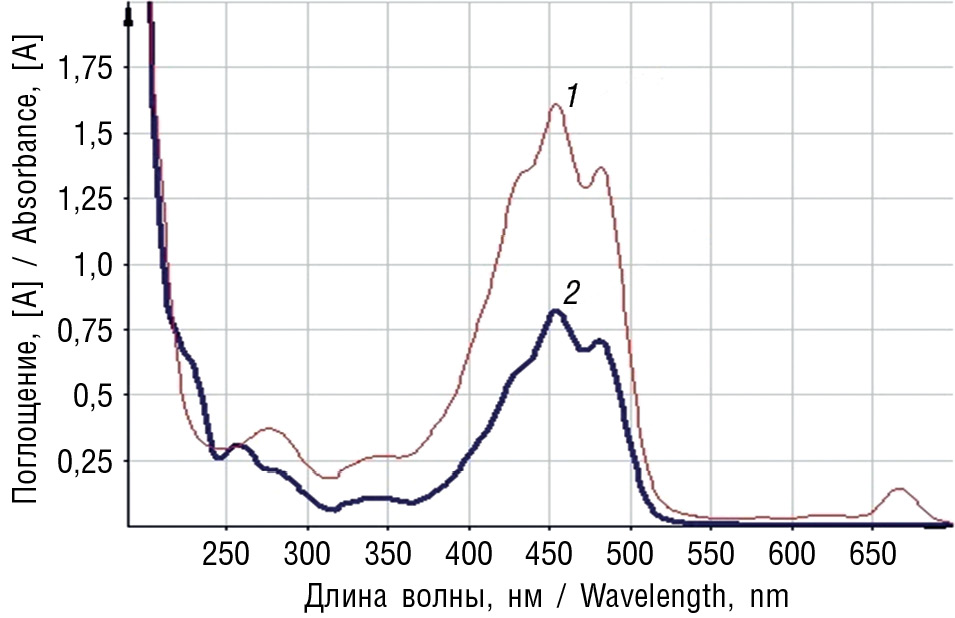 Рис. 1. Электронные спектры гексанового раствора суммы каротиноидов, полученных из биомассы спирулины (1), и испытуемого раствора после очистки на Al2O3 (2) / Fig. 1. Electronic spectra of the hexane solution of the total carotenoids obtained from the biomass of Spirulina platensis (1) and the test solution after the purification on Al2O3 (2)