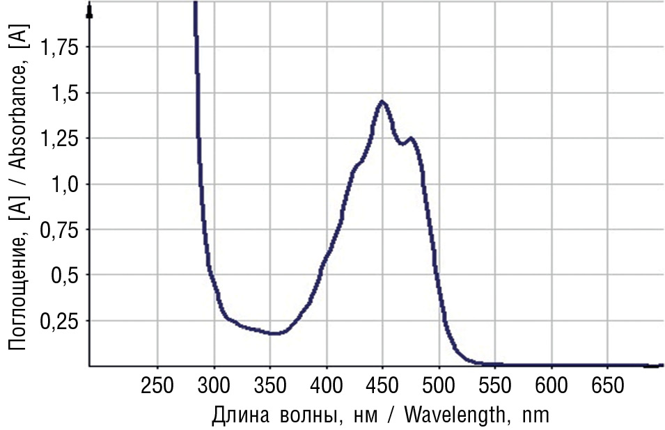Расчет количественного содержания β-каротина проводили с использованием удельного показателя поглощения рабочего стандартного образца β-каротина (2773) в н-гексане при длине волны 450 нм.