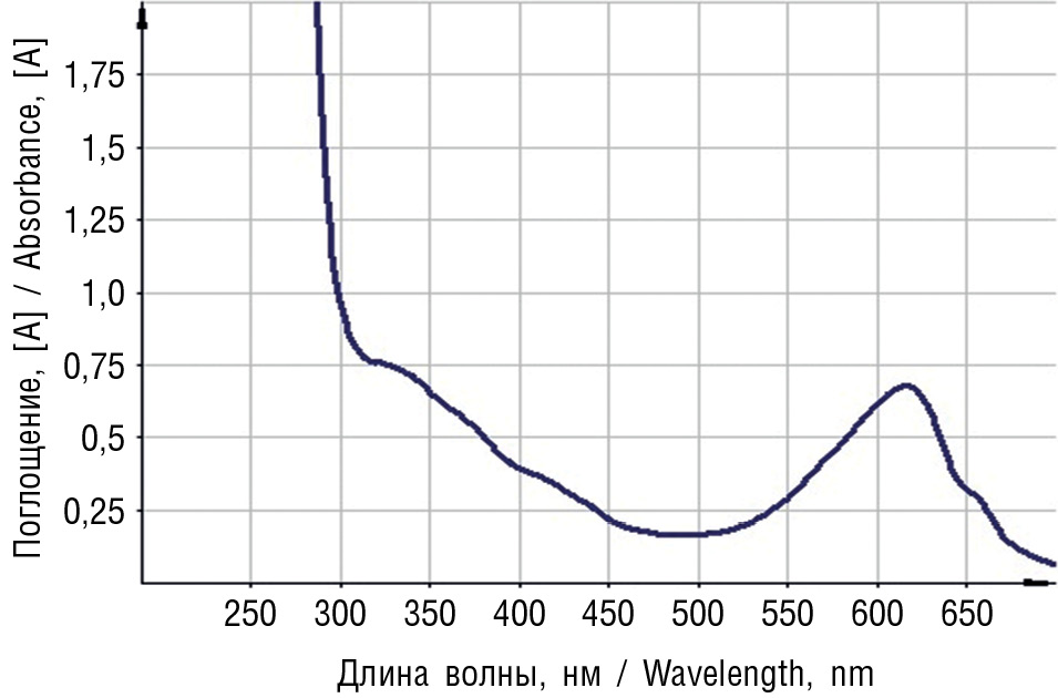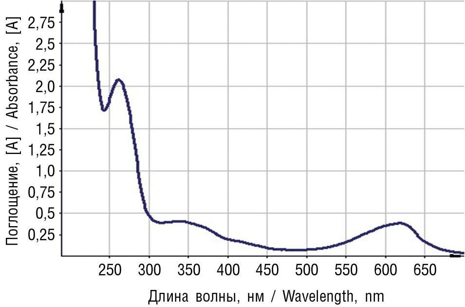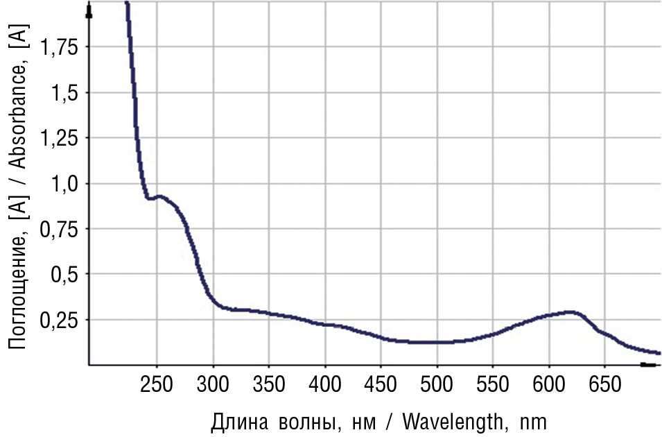 Рис. 3. Электронный спектр раствора фикоцианина, полученного из биомассы Spirulina platensis / Fig. 3. Electronic spectra of phycocyanin solution, obtained from Spirulina platensis biomass