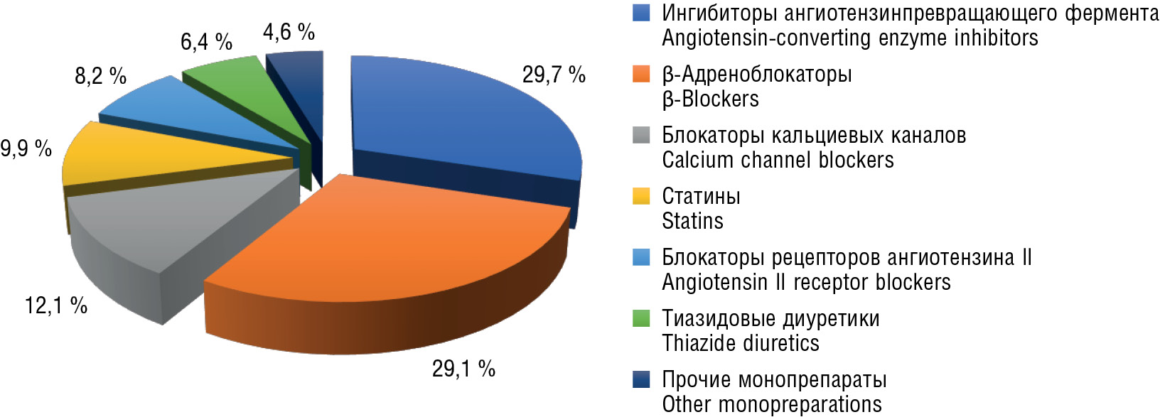Анализ позволил выявить особенности потребления ЛП внутри фармакотерапевтических групп. Например, в наиболее востребованной у конечных потребителей группе ингибиторов АПФ лидируют препараты с МНН эналаприл (59,0 % в общей структуре продаж этой фармакотерапевтической группы) и каптоприл (22,3 %). В группе β-адреноблокаторов лидируют препараты с МНН бисопролол (66,4 %) и метопролол (20,0 %). В группе «Тиазидовые диуретики» наиболее востребованы препараты индапамида. Лозартан и валсартан — лидеры продаж в структуре группы «Блокаторы рецепторов ангиотензина II». В группе «Блокаторы кальциевых каналов» наиболее потребляемыми оказались препараты амлодипина и нифедипина. В группе статинов преимущественно востребованы два препарата — аторвастатин (около 61 % в структуре продаж данной группы) и розувастатин (около 35 %).