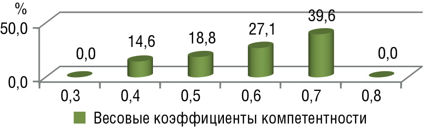Рисунок. Распределение экспертов по весовым коэффициентам компетентности / Figure. Distribution of experts by weight coefficients of competence