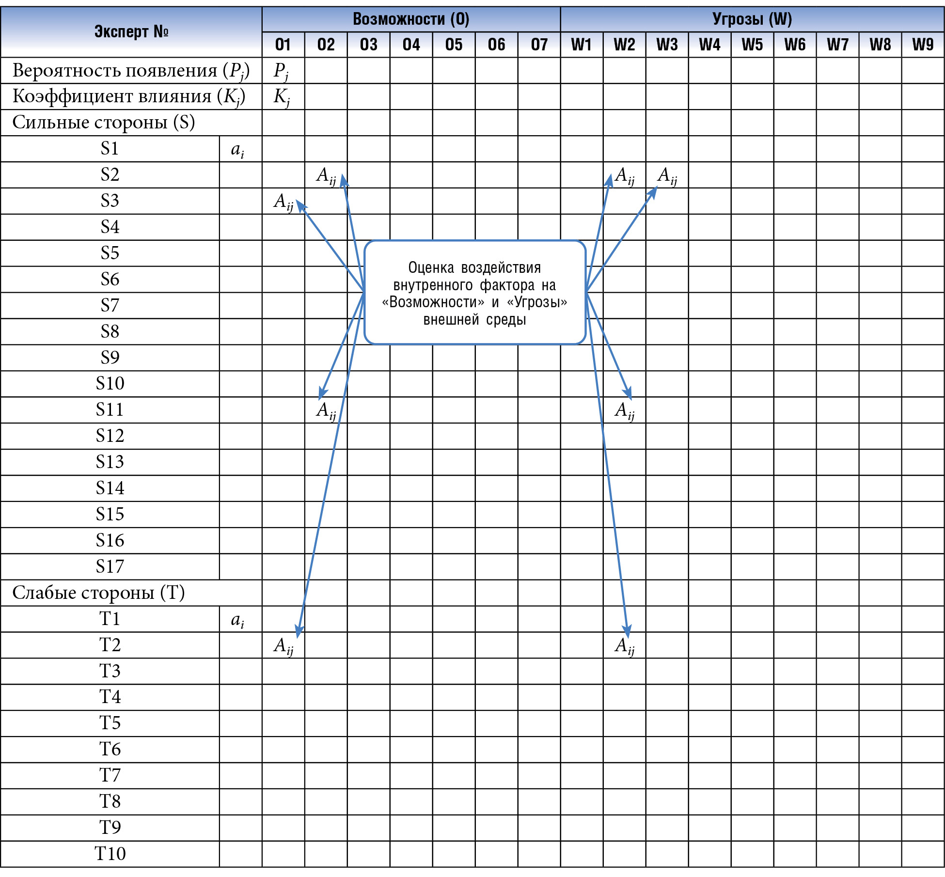 где: Nij — величина зависимости факторов; Aij — оценка взаимосвязи факторов внешней и внутренней среды; Kj — коэффициент влияния фактора внешней среды; Pj — вероятность появления внешнего фактора; aij — оценка интенсивности проявления внутреннего фактора.