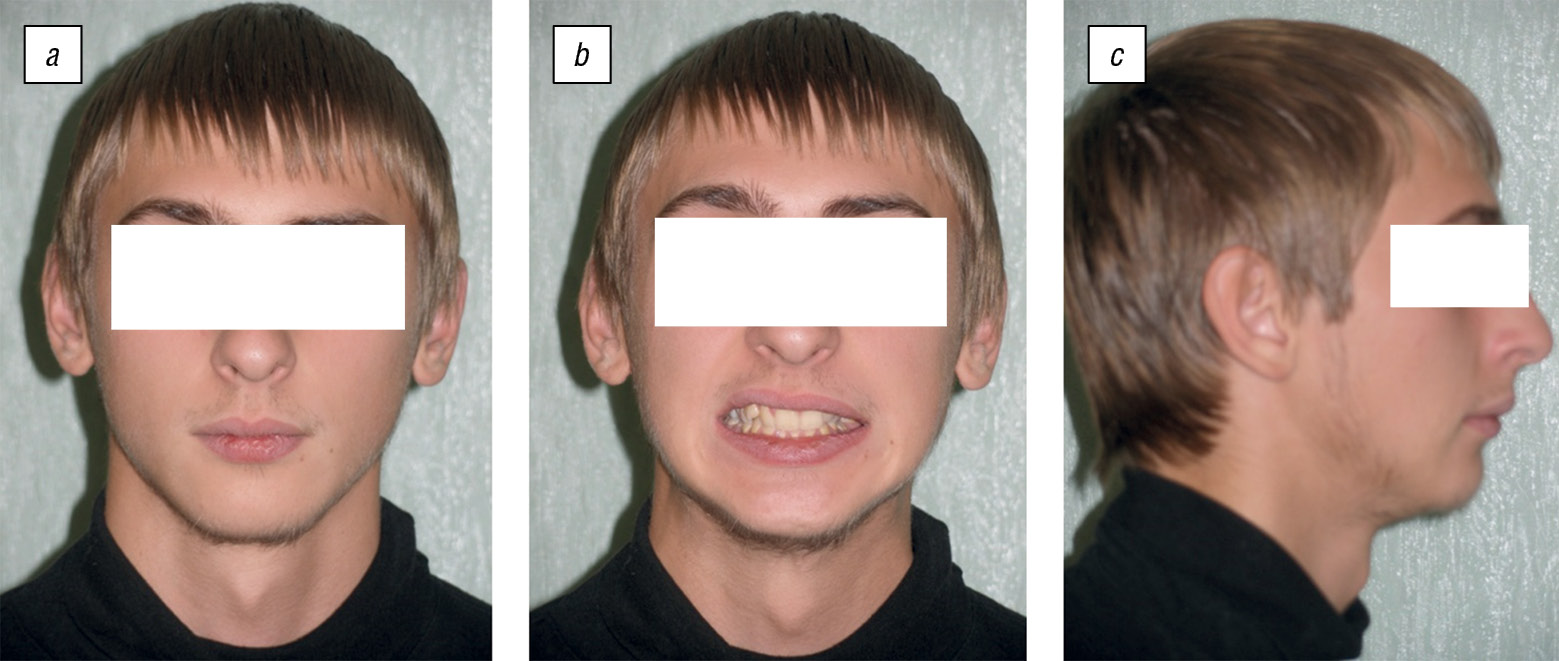 Рис. 1. Пациент П., 15 лет, первичный прием: а — фас; b — улыбка; c — профиль / Fig. 1. Patient P., 15 years old: a — front; b — smile; c — profile