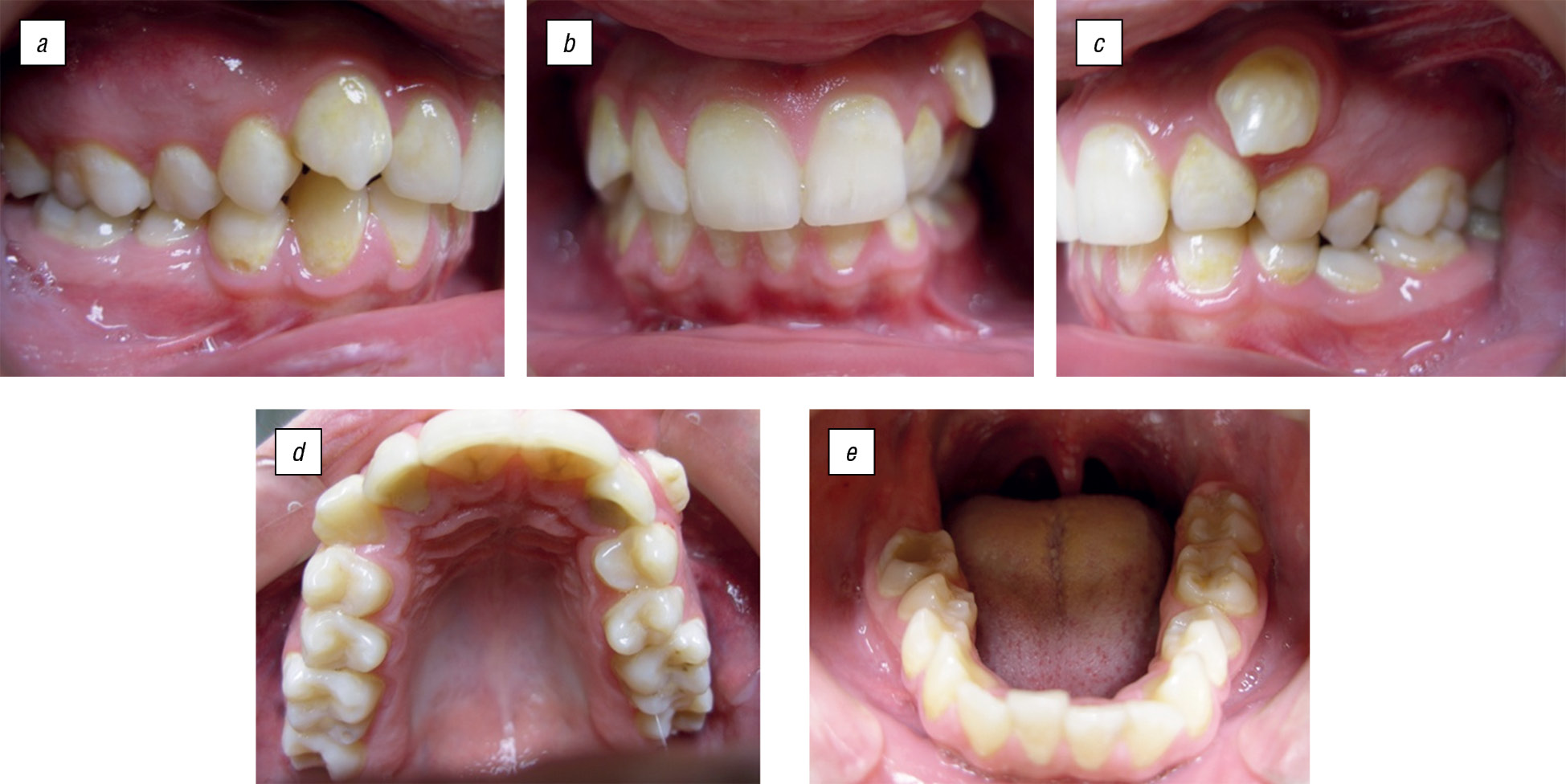 Рис. 2. Смыкание зубов-антагонистов пациента П., 15 лет: а — справа; b — передних; с — слева. Зубные ряды верхней челюсти (d); нижней челюсти (e) / Fig. 2. Occlusion of antagonistic teeth of patient P., 15 years old: a — right; b — front; c — left. Dentition upper jaw (d); lower jaw (e)