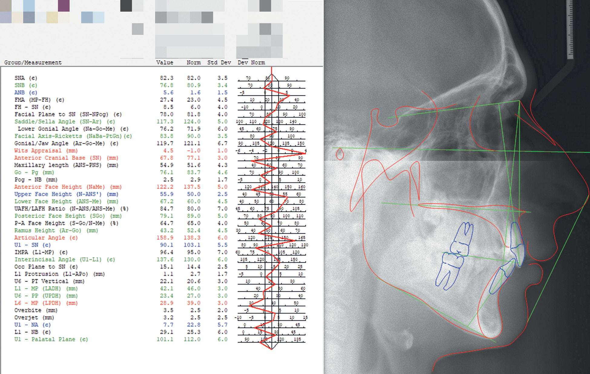 Результаты проведенного клинического обследования позволяют сделать вывод о наличии у пациента зубочелюстно-лицевой аномалии. На ортопантомограмме пациента выявлено наличие 32 постоянных зубов, зубы 1.8, 2.8, 3.8, 4.7, 4.8 находятся в ретенции (рис. 3). Для уточнения проведена ТРГ головы пациента в боковой проекции. Анализ ТРГ в боковой проекции в программе Dolphin Imaging (рис. 4) позволил поставить предварительный диагноз — дистальная окклюзия, гнатическая форма.