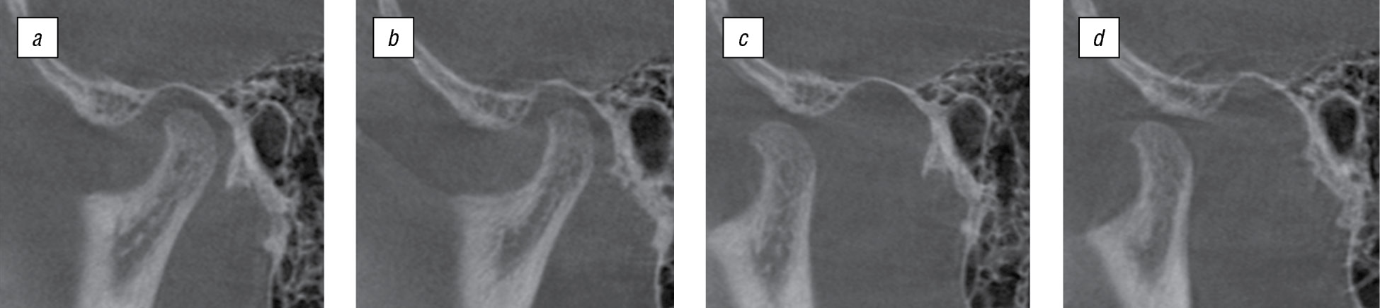 Рис. 5. Конусно-лучевая компьютерная томограмма височно-нижнечелюстного сустава пациента П., 15 лет: a — при закрытом рте справа: b — при закрытом рте слева; c — при открытом рте справа; d — при открытом рте слева / Fig. 5. Cone-beam computed tomogram of the temporomandibular joint of patient P., 15 years old: a — with the closed mouth on the right; b — with the closed mouth on the left; c — with the open mouth on the right; d — with the open mouth on the left