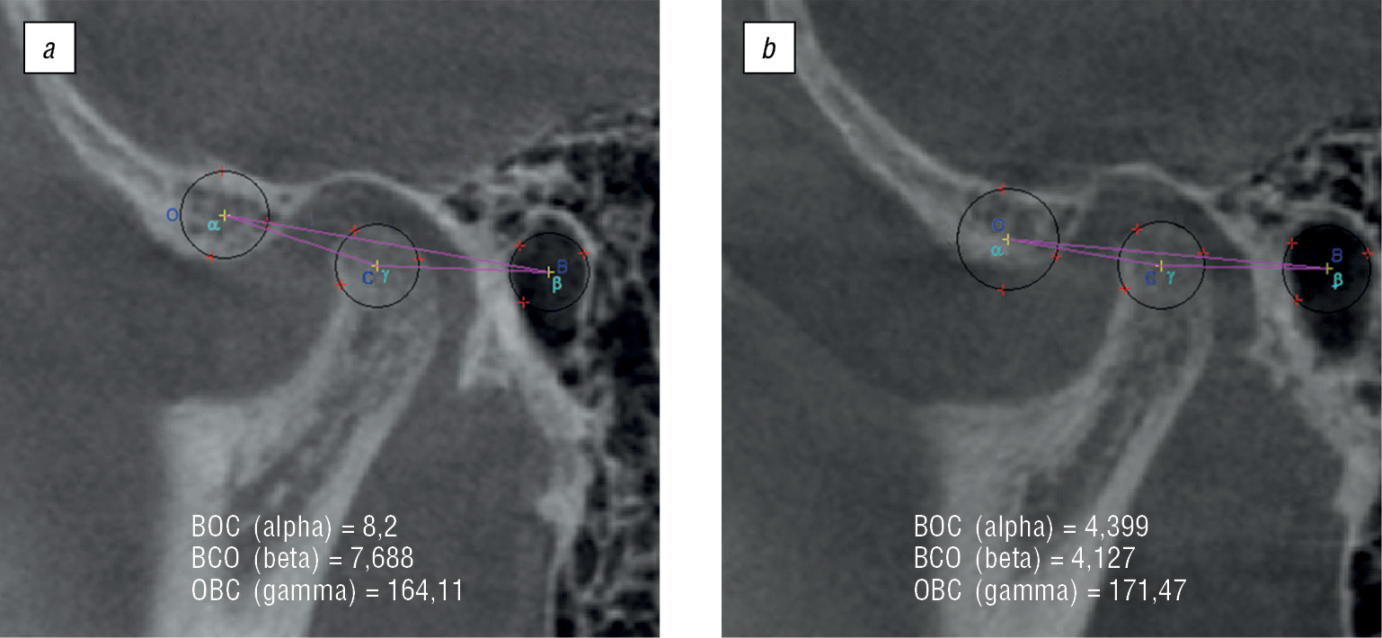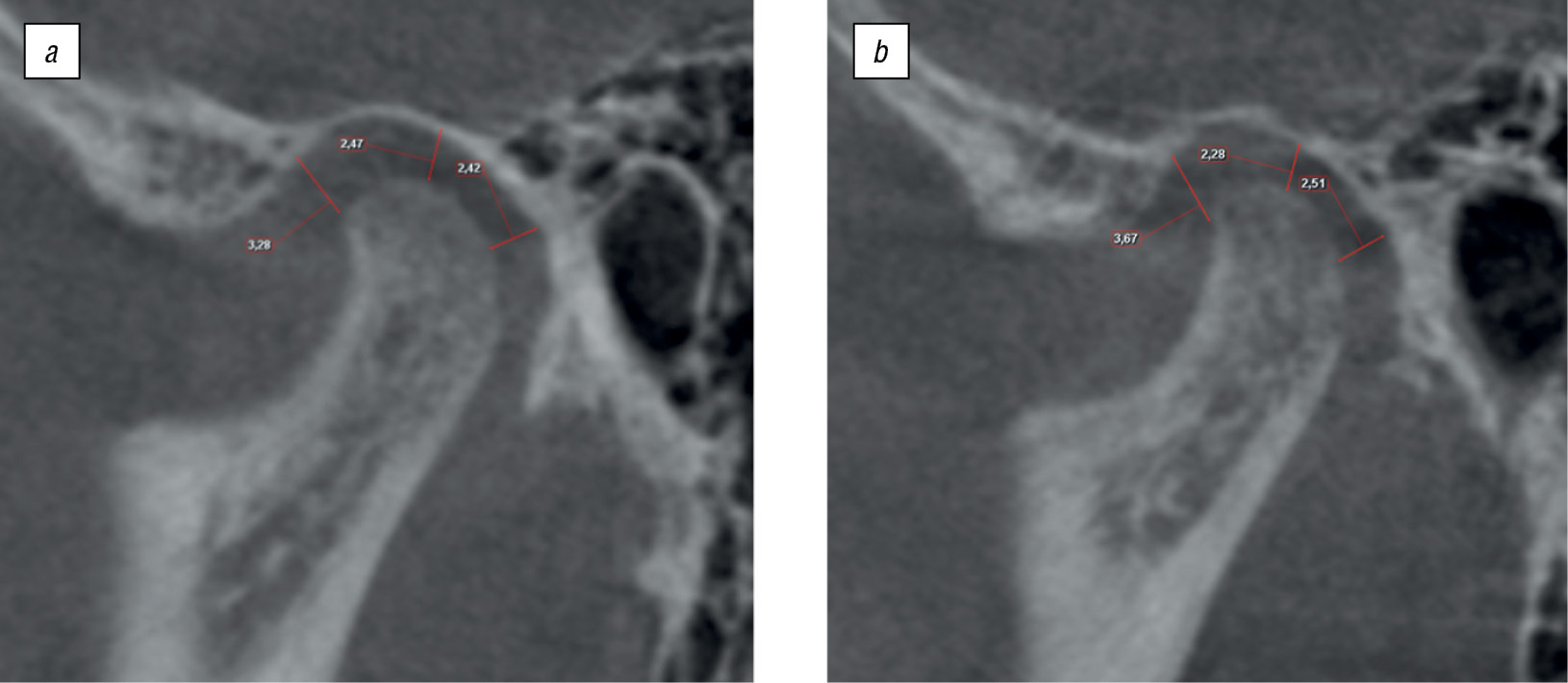 Рис. 6. Анализ томограмм височно-нижнечелюстного сустава по Н.А. Рабухиной пациента П., 15 лет: a — при закрытом рте справа; b — при закрытом рте слева / Fig. 6. Analysis of the temporomandibular joint tomograms according to N.A. Rabukhina, patient P., 15 years old: a — with the closed mouth on the right; b — with the closed mouth on the left
