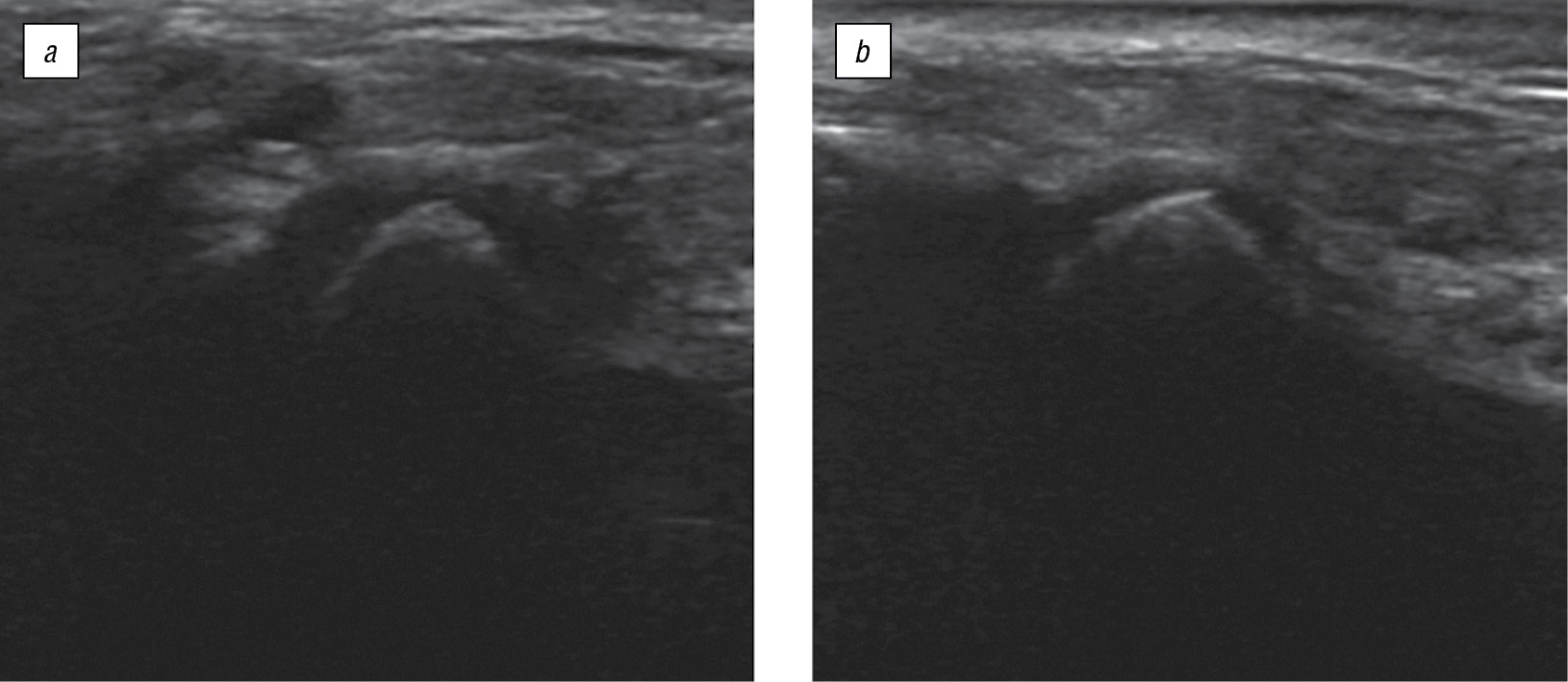 Рис. 8. Ультразвуковое исследование височно-нижнечелюстного сустава пациента П., 15 лет: a — справа; b — слева / Fig. 8. Ultrasound of the temporomandibular joint, patient P., 15 years old: a — on the right; b — on the left