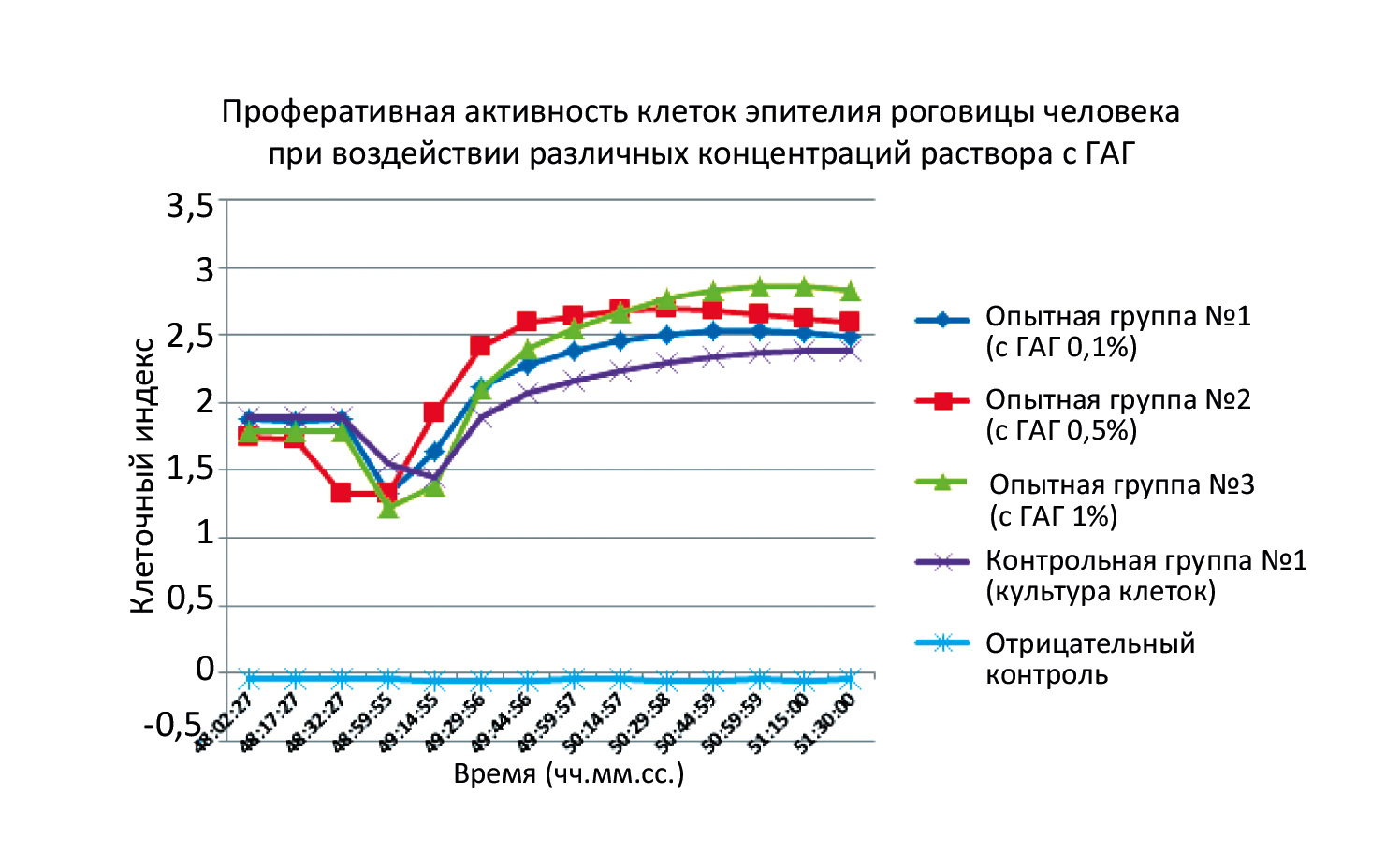 Выводы. Конечные показатели клеточного индекса указывают на то, что растворы смеси сГАГ в концентрации 0,5% и 1% оказывают более выраженное пролиферативное действие на клетки эпителия роговицы человека in vitro из диапазона исследуемых концентраций. Полученные результаты открывают перспективы применения сГАГ в разработке новых подходов к лечению пациентов, находящихся на хронической медикаментозной терапии, или пациентов с сопутствующими заболеваниями роговицы.
