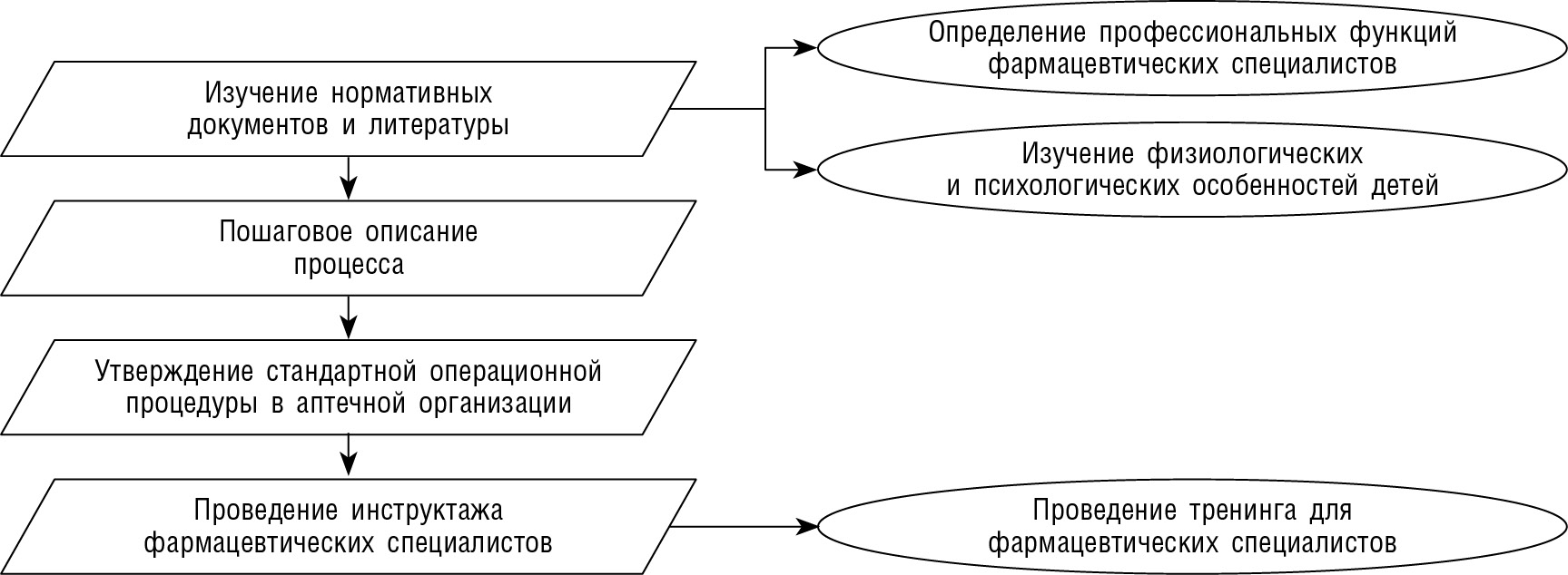 Рис. 2. Блок-схема разработки и внедрения стандартной операционной процедуры процесса фармацевтического консультирования с элементами фармацевтического просвещения несовершеннолетних посетителей в аптечной организации
