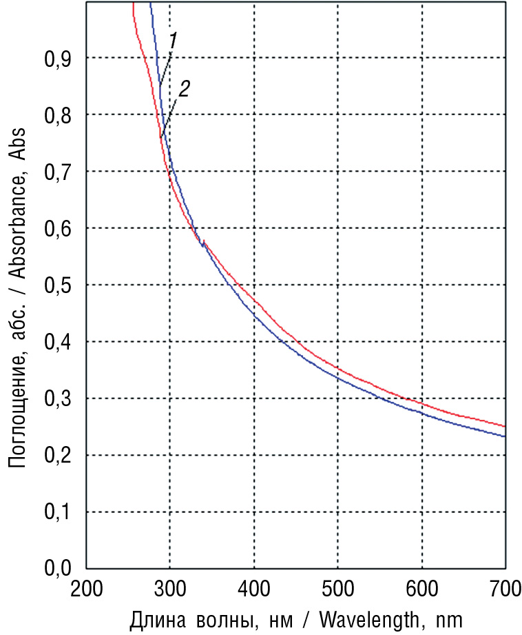 Рис. 1. Электронные спектры исходного раствора (1) и щелочно-аммиачного раствора суппозиториев с соком алоэ на гидрофильной основе (2)