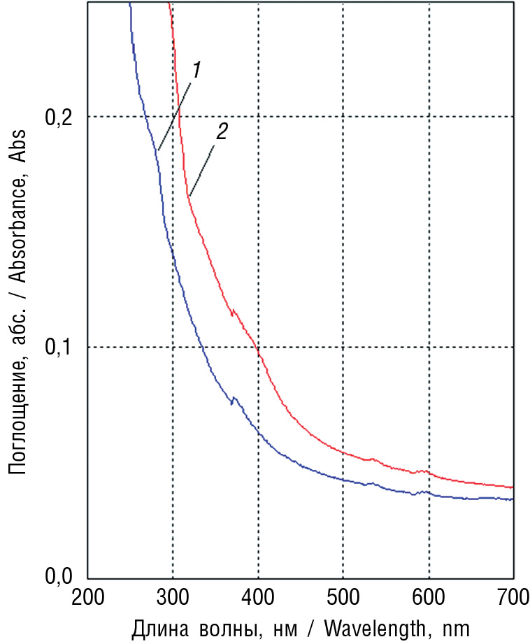 Рис. 2. Электронные спектры исходного раствора (1) и щелочно-аммиачного раствора суппозиториев с соком алоэ на липофильной основе (2)