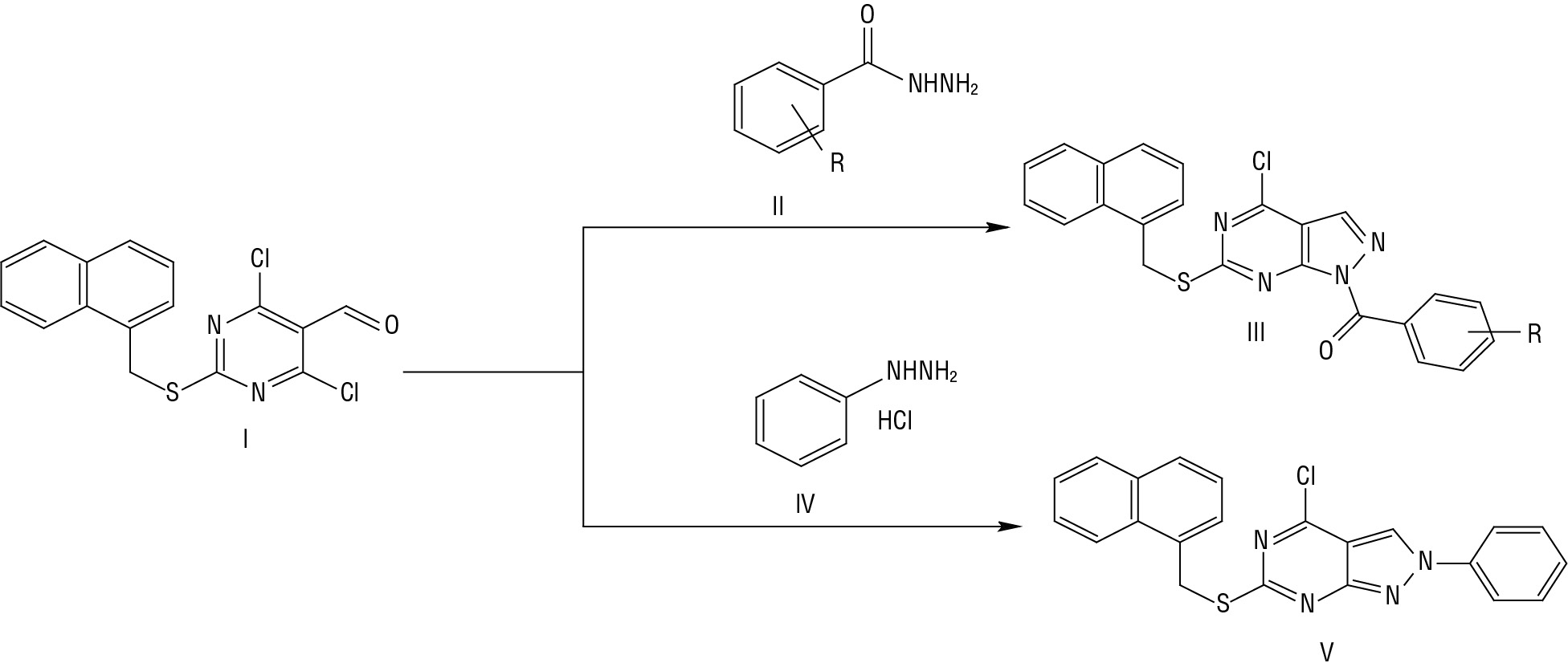 Новые 6-[(1-нафтилметил)тио]-4-хлорпиразоло[3,4-d]пиримидины получают взаимодействием 4,6-дихлор-2-[(1-нафтилметил)тио]пиримидин-5-карбальдегида (I) c замещенным бензгидразидом (II) (или замещенным фенилгидразином гидрохлоридом) в тетрагидрофуране при нагревании и перемешивании в течение 10–15 ч. Реакционную массу разбавляют водой и перемешивают. Полученный осадок фильтруют и промывают небольшим количеством воды. Выход продуктов составляет 50–85 % (см. рисунок).