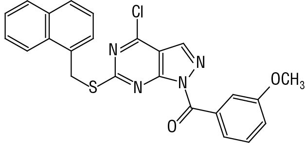 1-(3-Метоксибензоил)-6-[(1-нафтилметил)тио]-4-хлор-1Н-пиразоло[3,4-d]пиримидин | IIIa | >2000 | 8,5 ± 0,2 | 2 ± 1 | 1,98 | 98,02 |