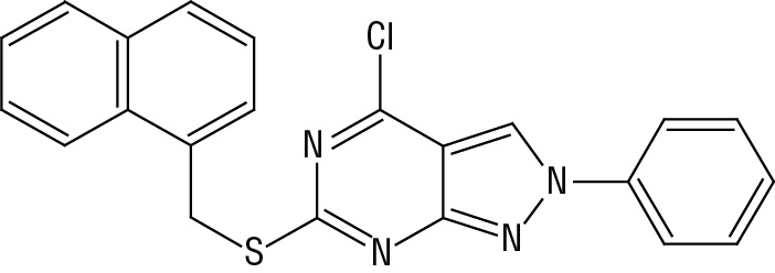 Синтез 6-[(1-нафтилметил)тио]-4-хлор-2-фенил-2Н-пиразоло[3,4-d]пиримидина (V). В круглодонную колбу емкостью 25 мл загружают 0,5 г (1,43 ммоль) 4,6-дихлор-2-[(1-нафтилметил)тио]пиримидин-5-карбальдегида (I) и 10 мл тетрагидрофурана, затем добавляют 0,21 г (1,43 ммоль) фенилгидразина солянокислого (IV) и 0,44 мл триэтиламина (3,15 ммоль). Реакционную смесь кипятят при активном перемешивании в течение 12 ч. Охлаждают, заливают 30 мл воды и перемешивают в течение 3 ч. В ходе перемешивания происходит перерождение осадка. В результате выпадает осадок почти белого цвета. Смесь отфильтровывают и промывают небольшими порциями воды очищенной. Получили порошок светло-желтого цвета, выход 76 %. Т. пл. 220 °С (разлож.). Спектр ЯМР 1Н (ДМСО-d6), δ, м. д.: 4,61 с (2Н, СН2), 6,86 д (1Н, Наром., J = 7,27 Гц), 7,37–7,47 м (1Н, Наром.), 6,75 д (1Н, Наром., J = 6,27 Гц), 7,85 д (1Н, Наром., J = 8,28 Гц), 7,91–7,95 м (3Н, Наром.), 7,99 д (1Н, Наром., J = 8,03 Гц), 8,21–8,26 м (2Н, Наром.), 10,52 с (1Н, Наром.). Найдено, %: C 65,54; H 3,72; N 13,88. C22H15ClN4S. Вычислено, %: C 65,58; H 3,75; N 13,90.