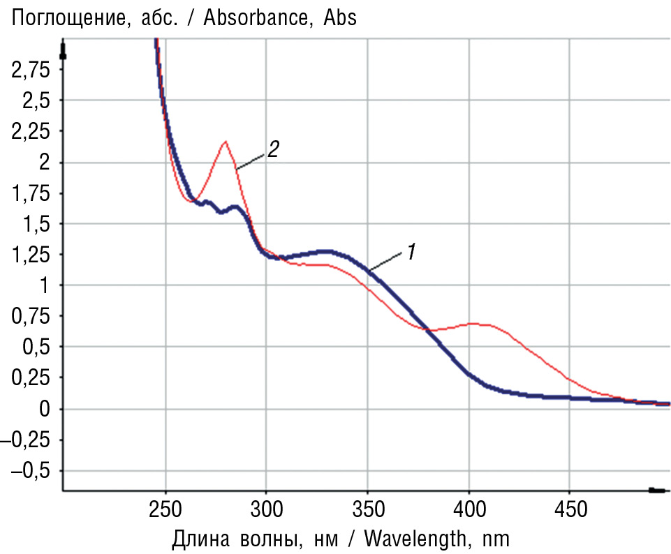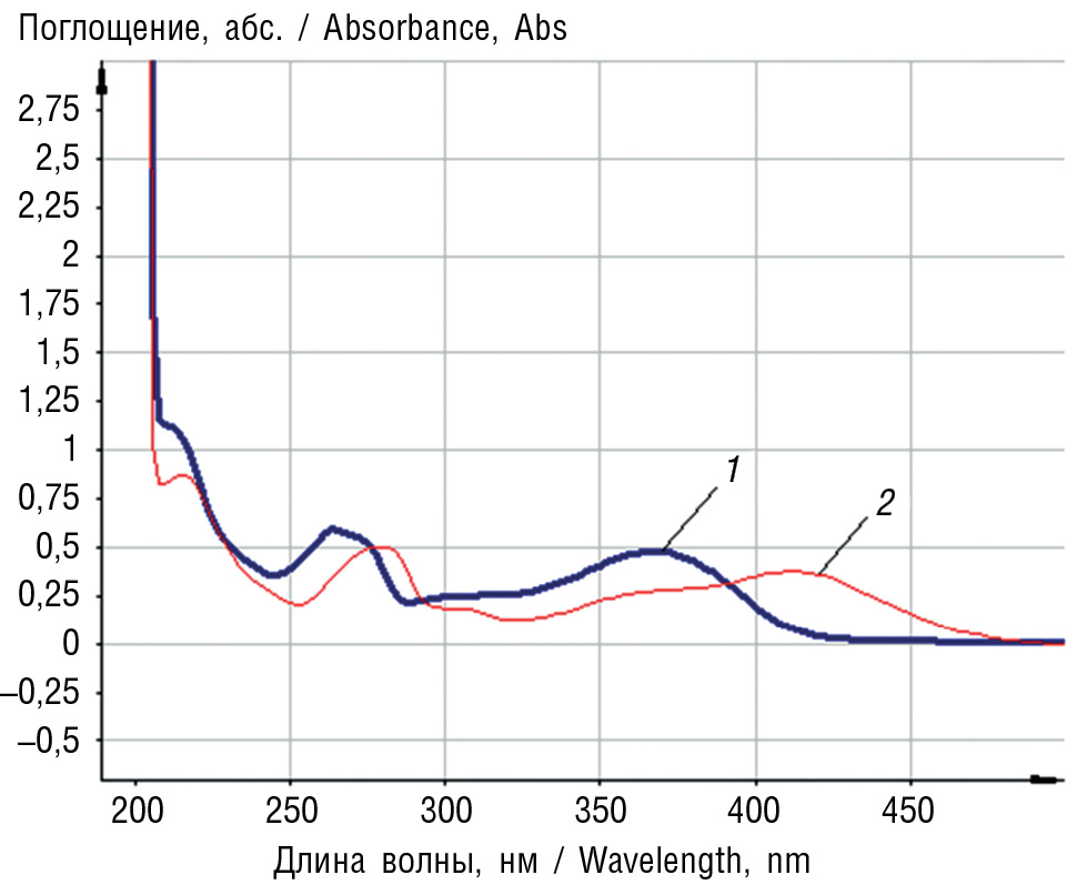 Рис. 1. Электронные спектры растворов водно-спиртового извлечения из листьев сирени обыкновенной: 1 — раствор извлечения; 2 — раствор извлечения с добавлением алюминия хлорида