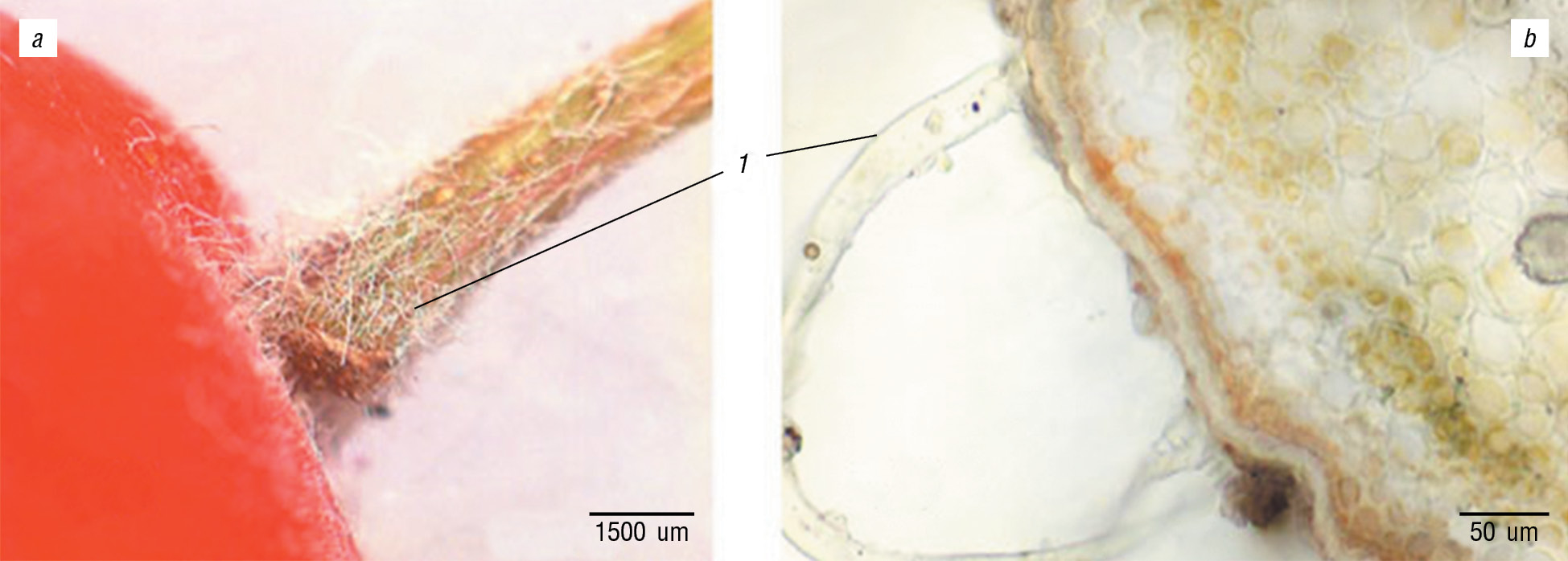 Рис. 3. Трихомы боярышника полумягкого: a — плодоножка; b — плодоножка, поперченный срез. Обозначения: 1 — простой волосок