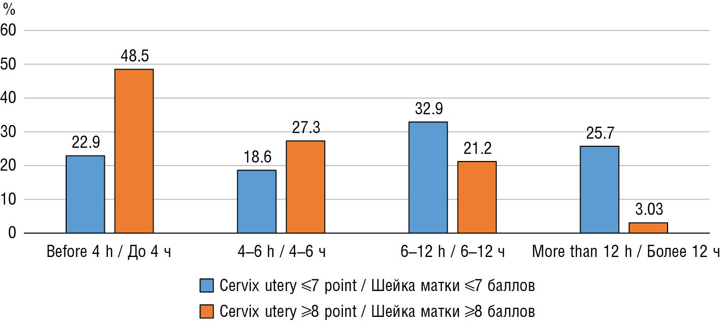 The main factor influencing the duration of the latent period in both full-term and preterm pregnancies is the degree of cervical maturity [9, 16]. This study confirmed this pattern. In most pregnant women in the comparison group, where the cervical maturity was ≥8 points according to Bishop (75.8%), labor developed <6 h after the amniotic fluid leak. In the main group, where the cervical maturity was ≤7 points according to Bishop (58.5%), >6 h passed from the amniotic fluid leak to labor onset. Thus, women with an unprepared birth canal need nearly two times more time for the development of active labor. A mature cervix is one of the main factors in assessing the prospects for labor induction; labor developed spontaneously in all patients in the comparison group. In 22.8% of pregnant women in the main group, labor developed spontaneously on average within 6 h, despite the initially unpromising cervix. As a result, a fifth of pregnant women with an unpromising cervix, labor still develops within the next 6 h.