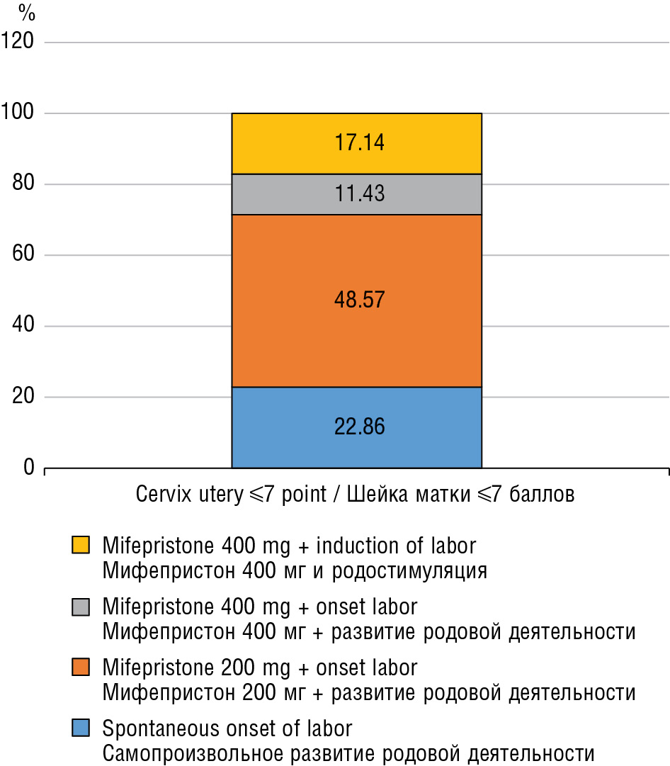 Results. The time from the moment of discharge of amniotic fluid to the onset of regular labor in the group with a cervix ≤7 Bishop points was 7.82 ± 4.53 hours, while in the group with a cervix ≥8 Bishop points it was 4.4 ± 3.23 hours (T = –5.02; p < 0.001). The most significant effect on the duration of the latency period was the assessment of the cervix according to Bishop scale (r = –0.48; p < 0.001), the gestational age was in the second place (r = –0.23; p = 0.08). In patients who didn’t take mifepristone, the main factors influencing the duration of the latency interval were fetal weight (r = –0.31; p = 0.004) and gestational age (r = –0.29; p = 0.008); the increase in these parameters led to the decrease in the latency interval. Women who received 200 mg mifepristone in labour had a significant positive correlation with maternal age (r = 0.36; p = 0.04), negative with maternal weight (r = –0.42; p = 0.01) and cervical Bishop score (r = –0.48; p = 0.004). Women in labor with the longest latency interval, who received mifepristone in a daily dosage of 400 mg, have an inverse correlation for the gestational age (r = –0.39; p = 0.09), connection with the degree of cervical maturity, age, constitutional features, gestational age was not revealed.