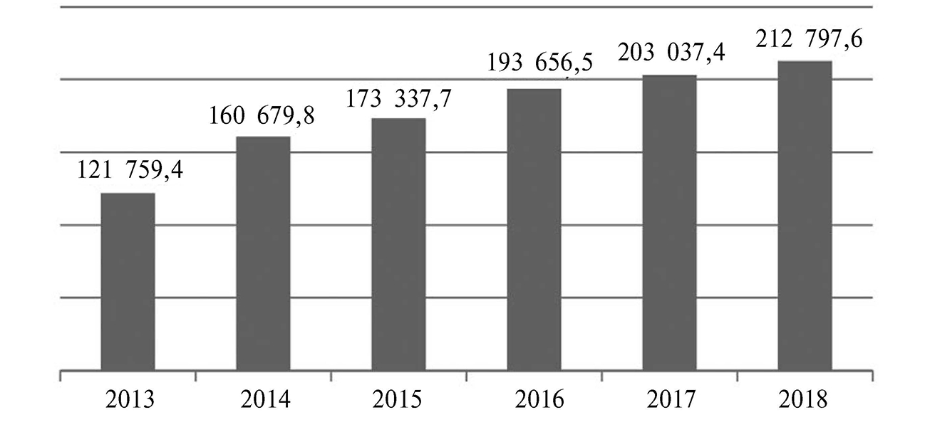 Динамика увеличения финансирования судебной системы Российской Федерации за 2013–2018 гг. (в млн руб.)1