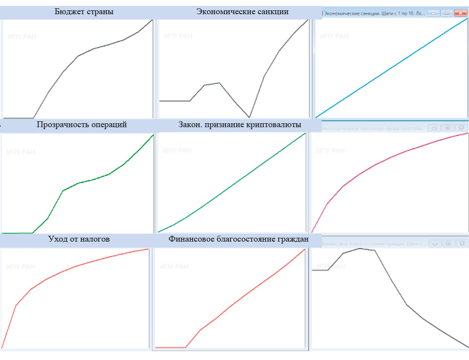 На рис. 6 представлена динамика изменения значимых факторов пятого сценария развития ситуации, в которой учитывается влияние законодательного признания сферы криптовалют, на фоне воздействия санкций.