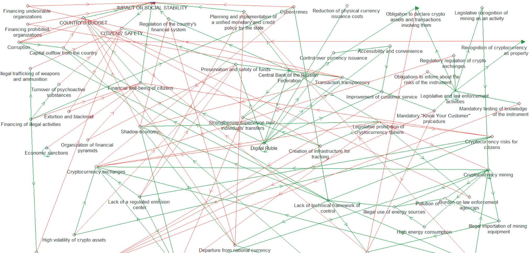 In the course of the study, a model for the development of the cryptocurrency sphere in the Russian Federation was constructed to assess the impact of cryptocurrency on social stability, taking into account various scenarios of state regulation, with legal regulation being the most important. Several modifications of the model took into account the main threats associated with the uncontrolled use of cryptocurrency, including being used for illegal activities. In addition, the proposals of the Russian regulators were taken into account, as were the threats, and opportunities associated with the creation and integration of the digital ruble.