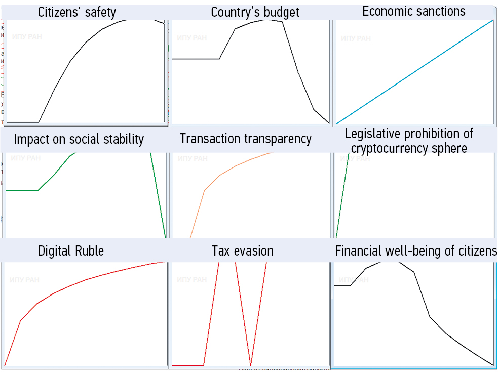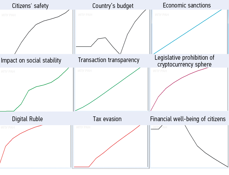 This scenario is quite promising from the point of view of its impact on social stability, but it is worth considering that the uncontrolled use of cryptocurrencies leads to very negative consequences that can emerge over such a long period that the model presented does not allow them to be taken into account. If we consider the simulation model in more detail, then the legislative recognition of cryptocurrency with the factors of the absence of a regulatory framework and technical controls will lead to an increase in cybercrime and avoidance of the national currency, and just such risks were warned of by the Central Bank of the Russian Federation in its report on cryptocurrency.