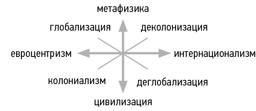 Приветствуя авторов, выступивших против однолинейности европейского вектора развития МП, за инклюзивный подход к глобальной истории (включение неевропейских обществ и регионов), который возник как ответ западных историков на вызовы глобализации, ратуя за «радикальное изменение словаря» [Ibid., p. 330] и необходимость критики «стандарта цивилизации» [Ibid., p. 330], А.-Ш. Мартино также говорит на языке центра и периферии, неизбежно связанном, по нашему мнению, с концептами господства и колониализма. Данное видение сопряжено, кроме прочего, и с «волнением» автора по поводу «учета многополярной перспективы», в результате которой либерально-плюралистический проект «делает свою собственную политику невидимой», сохраняя при этом «устойчивость евроцентрических голосов» [Ibid., p. 331].