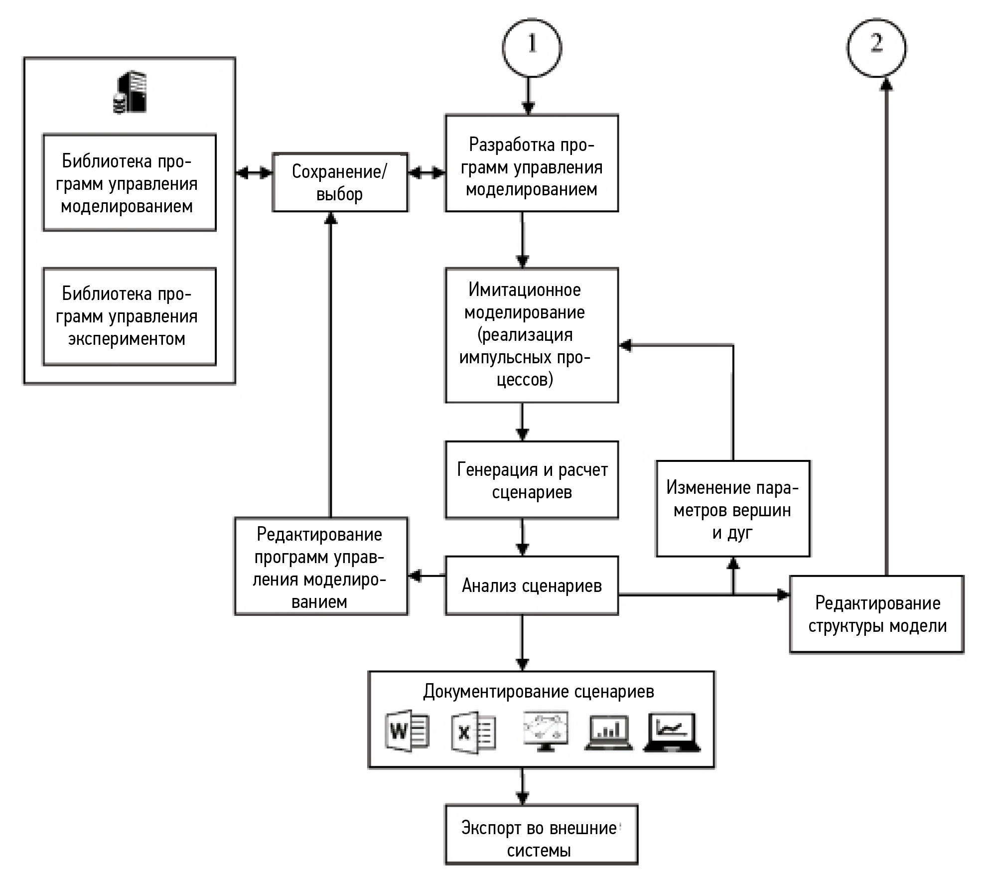 Fig. 3. Extended functional structure of a scenario modeling software-analytical complex (modeling process)