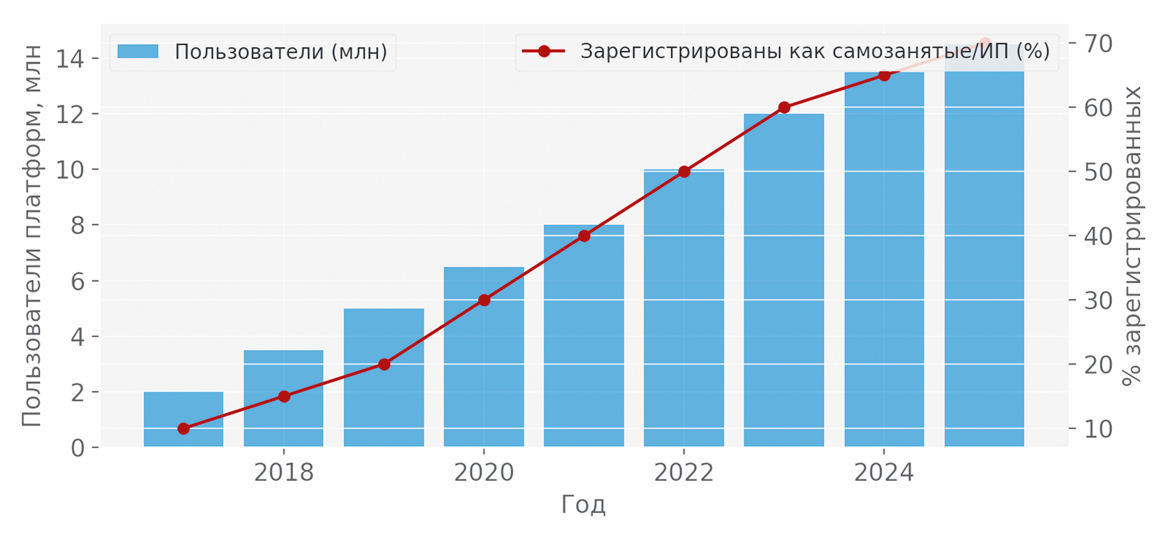 Рис. 1. Рост пользователей платформ и уровень регистрации исполнителей.