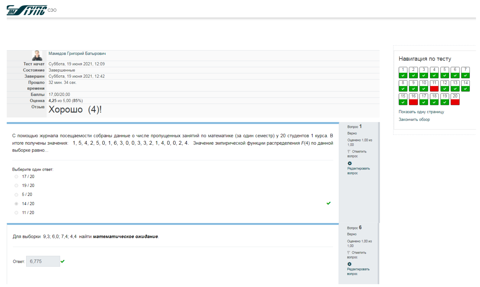 Рис. 2. Фрагмент теста по математической статистике (базовый уровень)
