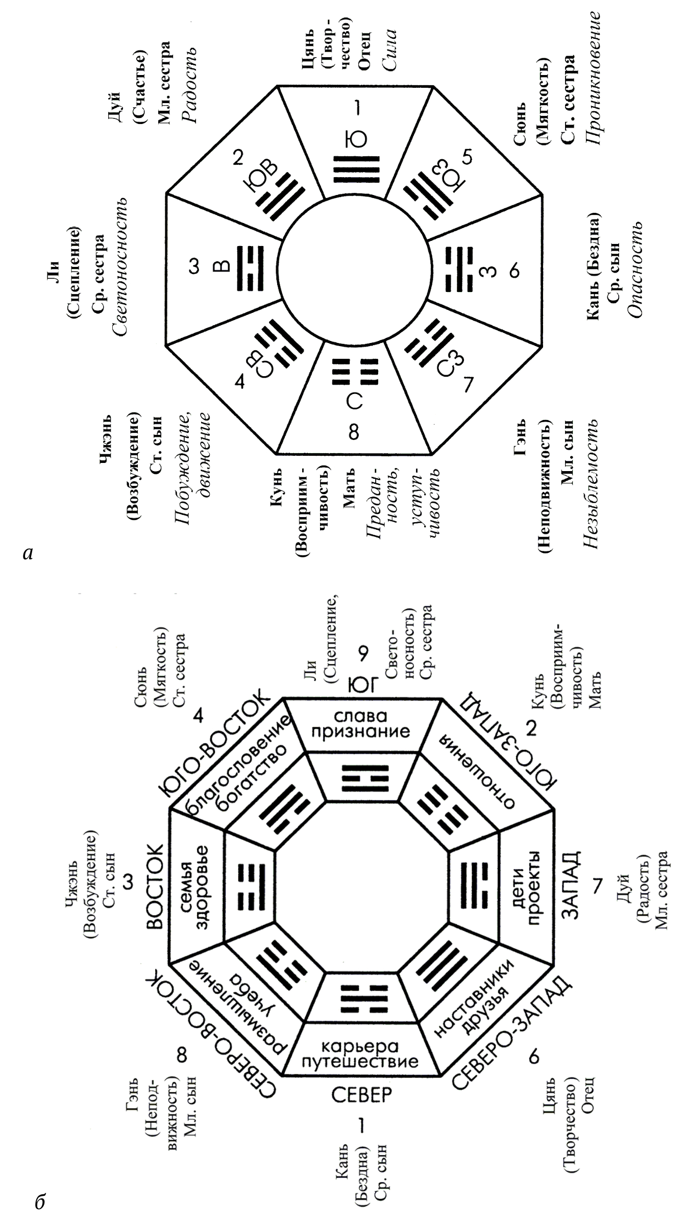 (Spatial orientation of the stages of creation in Ancient China: a – Primordial Bagua of trigrams (based on [2, p. 28]); b – Manifested Bagua [2, p. 29])