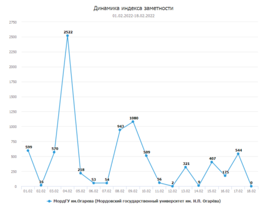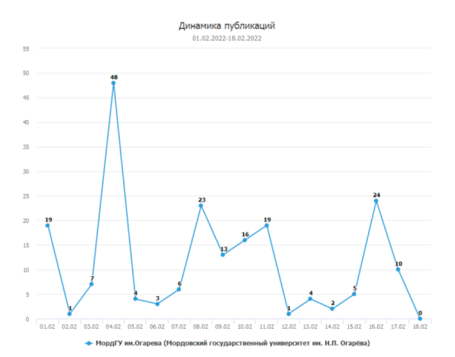 Например, выгружаемый из системы за период исследования (1–18 февраля 2022 г.) отчет включает таблицы, графики, тексты новостей федеральных и региональных СМИ, упоминающих Мордовский государственный университет им. Н.П. Огарёва. Временной период для анализа сознательно выбирался небольшой (чуть больше двух недель), т.к. целью преимущественно был показ возможностей и потенциала автоматизированной системы «SCAN-ИНТЕРФАКС» для студенческих исследований.