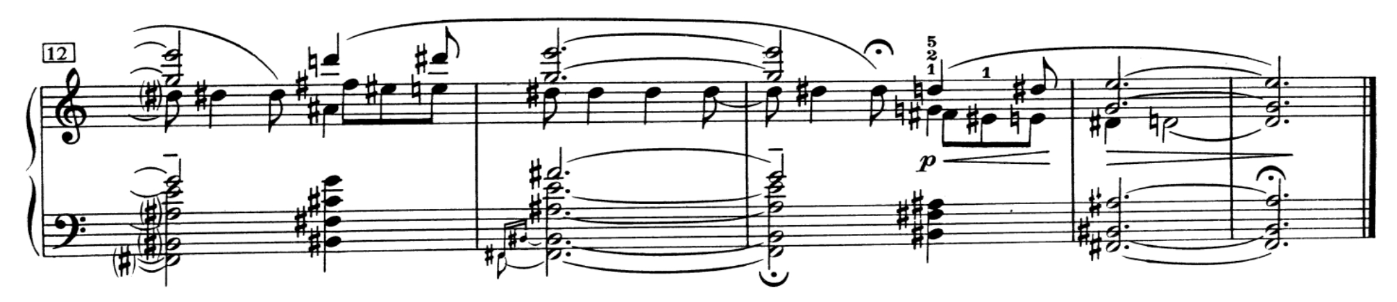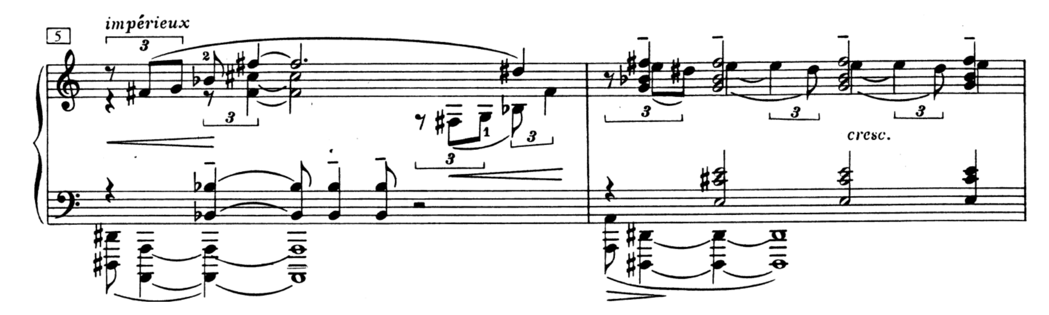 Нарастающие гулкие удары «литавр» в басу (тт. 1, 3, 9, 11) и одиночные фанфары в октавном удвоении (тт. 2, 4, 10, 12) подобны воинственным звукам, когда-то сопровождавшим древние битвы. Набегающие волны коротких мотивов одна за другой охватывают все большее тесситурное пространство (тт. 1, 3, 9, 11). Их мерный бег останавливает триольный мотив второго такта, будто «падающий» в аккорд. Хроматическая октавная интонация поддерживает аккорд: темная глубь под блистающим «гребнем». Волна, достигнув вершины, откатывается и рассыпается «пеной» секстолей шестнадцатых, в которых слышен и колокольный резонанс (тт. 2, 4, 10, 12). Из второй, угасшей было, волны, из мрака «упавшего» в контроктаву тритона не просто звучит, а почти буквально поднимается повелительный возглас (impérieux). Его поддерживает фанфарная имитация среднего голоса: одна мощная волна накрывает другую (тт. 5).