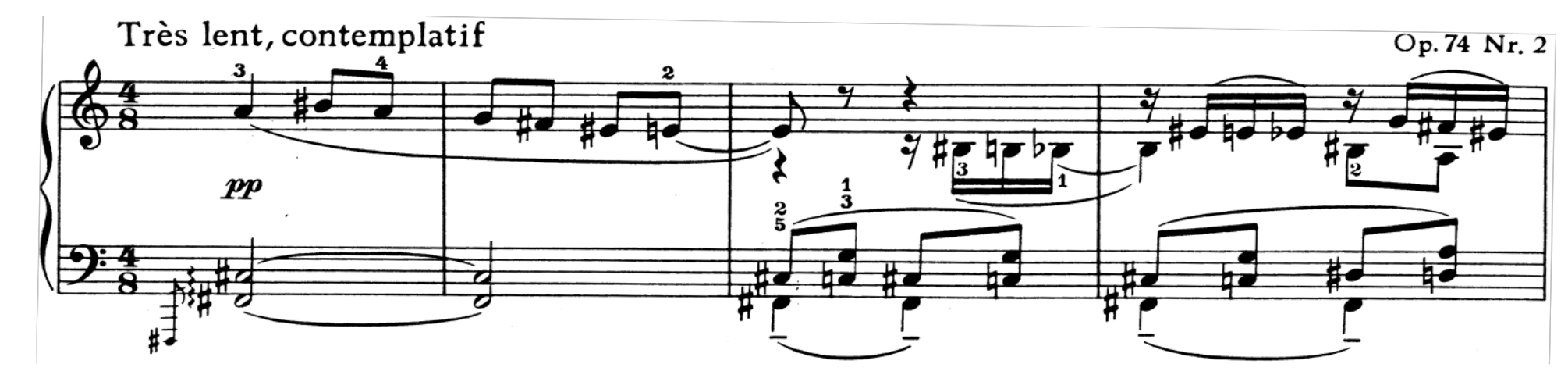 План Мистерии, а затем Предварительного действа генерировал новую образную сферу, диктовал и новые средства воплощения идеи. Все, чем был занят композитор было направлено на подготовку «последнего экстатического танца» человечества. Музыка, сочинение, концертное исполнение, издание произведений – лишь подготовительные шаги к приближающейся, готовящейся самим композитором вселенской катастрофе, в которой он призван играть главную роль. В результате все, что делает композитор, становится инструментом осуществления грандиозной мечты: музыкальные произведения – эскизами будущей Мистерии, концерты – некими воспитательными моментами, готовящими единомышленников к последнему экстатическому танцу. Постепенно меняется музыкальный язык, музыка будто подчиняет себе композитора, он ищет и находит новые созвучия и ритмы, но именно те, которые ему «подсказывает» развивающийся материал творчества. «Стремление к обостренности звучания посредством усложнения гармонического языка красной нитью проходит через все творчество», – пишет О.Е. Сахалтуева – исследователь гармонии А.Н. Скрябина [16, с. 3]. Последние опусы А.Н. Скрябина постепенно теряют гармоническую «экзальтацию», теряют «цвет». Это в той или иной мере имеет отношение к произведениям, написанным за 1914 год: Поэмы соч. 71, Поэма «К пламени» соч. 72, «Гирлянды» и «Темное пламя» соч. 73 и Пять прелюдий соч. 74. Гармониемелодия постепенно уступает место гомофонии и имитационной полифонии. Эмоциональные состояния приобретают качественность длиннот, заостренность контрастов снижается. Как пишет В.В. Рубцова «на всем лежит печать некой самоуглубленности, раскрывающей, особенно в пяти прелюдиях ор. 74, новые грани философского осмысления бытия, его прикосновения к “смерти белому звучанию”» [13, с. 390].