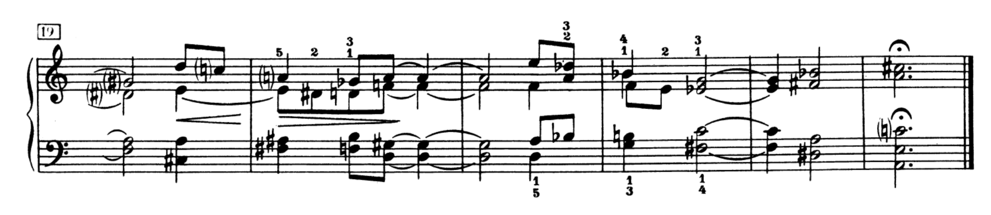 Остинато баса fis, почти неизменяемая повторность чередующихся квинт дают ощущение статики. Повисают «гирлянды» нисходящих хроматизмов среднего голоса, мерцают минорные и мажорные терции кружащейся мелодии восьмых в верхнем голосе. Это магическое движение «по кругу» может длиться бесконечно, мы как бы смотрим в отверстые двери в «ничто», встречаем в терцовом изложении темы леденящую душу улыбку «белой сестры» (в настойчивой регулярности появления мажорной терции fis-ais – мистическая «радость» этой улыбки).