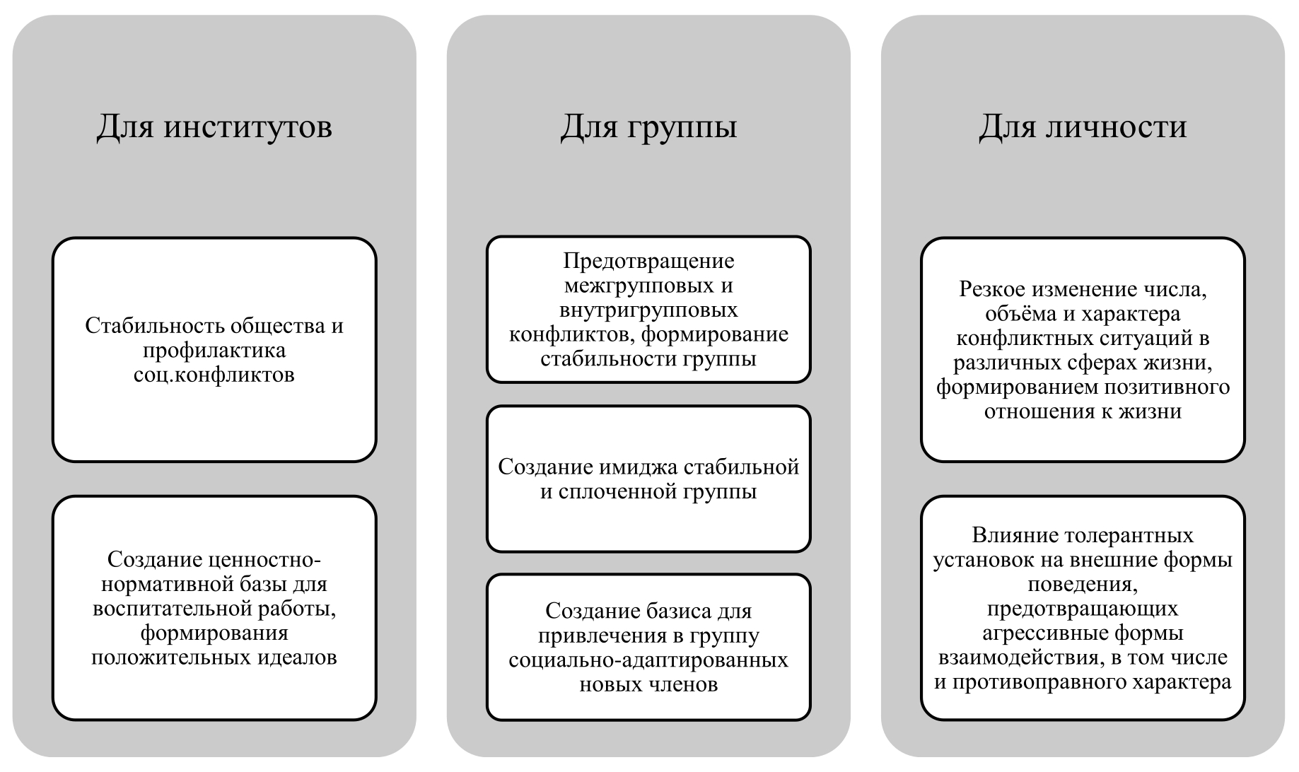 Tolerance in this context is not just the ability to accept the culture of another person (people), but also to take part in it in some way or to carry out active interaction. On this basis, we can say that tolerance has a number of functions that are valid both separately for an individual and a group, and for entire institutions: stability in society, reducing the number of conflicts between representatives of different cultures, forming the foundations for the upbringing of the future generation, etc.
