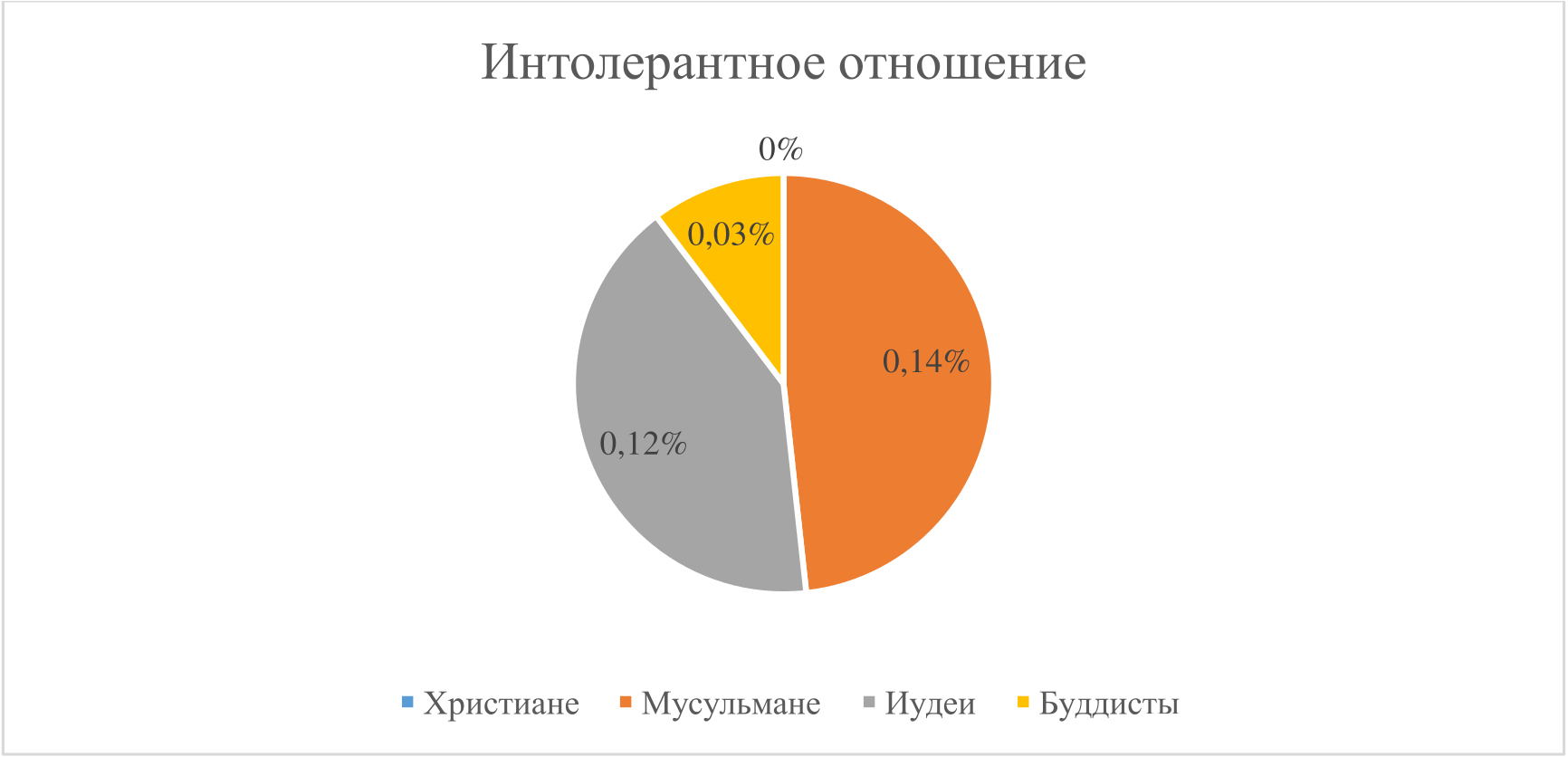 A theoretical analysis and a survey of representatives of various faiths showed that the level of tolerance is highest among Christians (there are no people with an intolerant attitude among 20 respondents), lower among Muslims (Sunnis) (14 out of 20 respondents have an intolerant attitude).