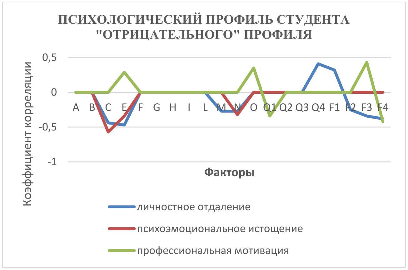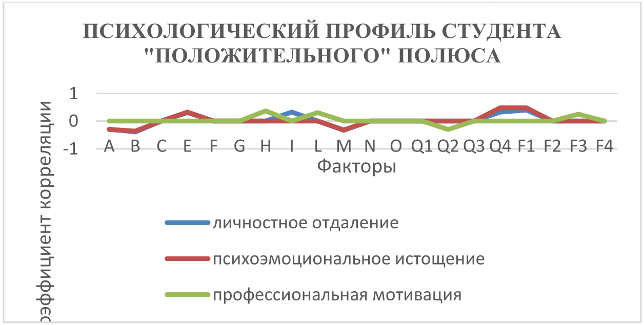 Необходимо отметить, что при проведении анализа полученных результатов для построения «психологического профиля личности» студента в «отрицательном» и «положительном» полюсах учитывались только положительные показатели средней (0.25-0.49) и высокой (0.50-0.74) корреляции.
