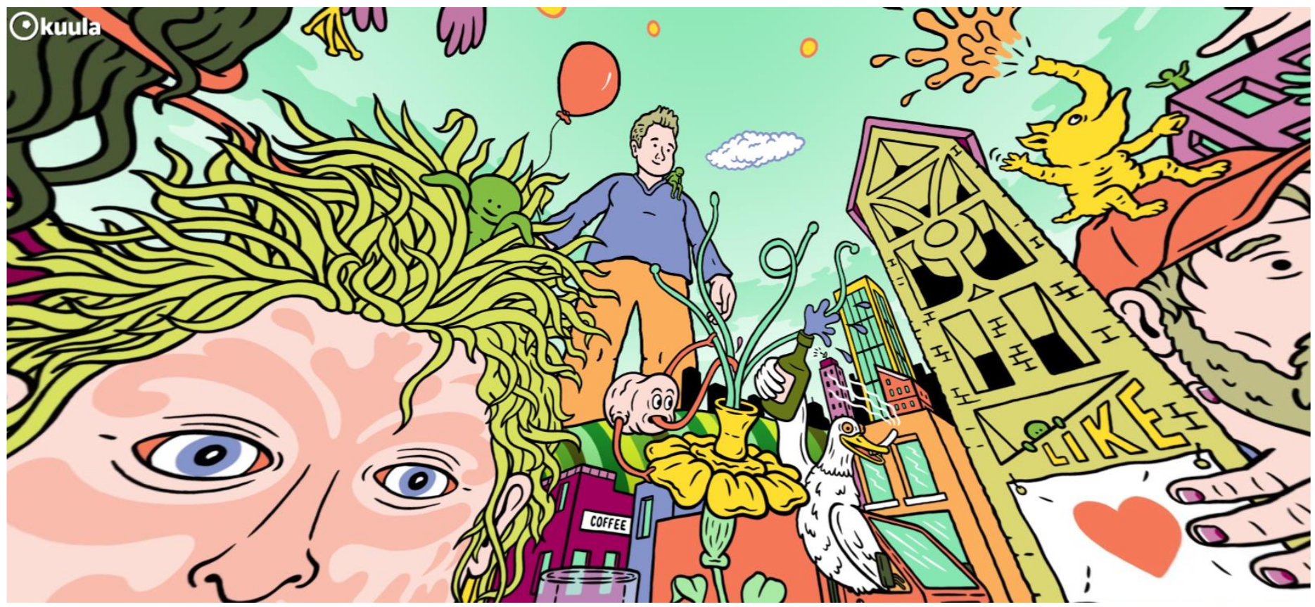 Подобные изображения, предназначенные для показа с помощью электронных устройств (включая мобильные устройства, компьютеры, VR-гарнитуры), подходят для создания многофигурных панорам с большим количеством деталей. Ввиду того что изображение не явлено зрителю целиком, последнему нужно «осмотреться», используя, к примеру, мышь или клавиатуру. Также чрезвычайно интересным в такого рода иллюстрации представляется выстраивание смысловых/нарративных связей внутри самого изображения. Так, художник может удивить или напугать зрителя, разместив у него за спиной или над головой какие-то элементы изображения. В качестве примера приведём иллюстрацию Мэтта Джонстона (Matt Johnstone) – «Мир Мэтта 360°» («Matt's 360 World»). Художник создал причудливый мир, который населяют странные разноцветные существа, порождённые его воображением. Иллюстрация напоминает изображение из виммельбуха, оно насыщено деталями, интригует и увлекает зрителя. Важнейшим качеством подобного рода иллюстраций является иммерсивность, т.е. эффект присутствия. Нам не нужно прикладывать дополнительных усилий, чтобы погрузиться в историю – мы сразу оказываемся в центре событий.