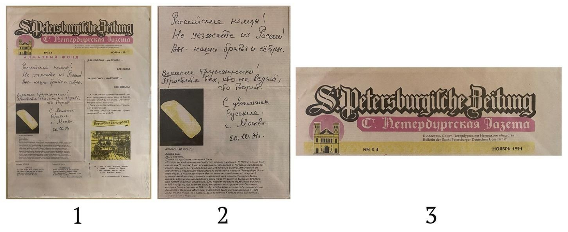 Введение. В фонде Саратовского областного музея краеведения в зале с постоянно действующей экспозицией, посвященной истории немцев Поволжья, на одном из стендов размещены образцы периодических изданий, в которых освещались вопросы культурной, экономической, исторической жизни переселенцев, оказавшихся волею судьбы по приглашению императрицы Екатерины II на территории России. На центральной полосе Санкт-Петербургской газеты (S-Peterburgische Zeitung) размещено интересное рукописное письмо следующего содержания: «Российские немцы! Не уезжайте из России! Вы – наши братья и сёстры. Великие труженики! Простите тех, кто не ведает, что творит. С уважением, русские. г. Москва, 20.10.91 г.» [12] (рис.1).