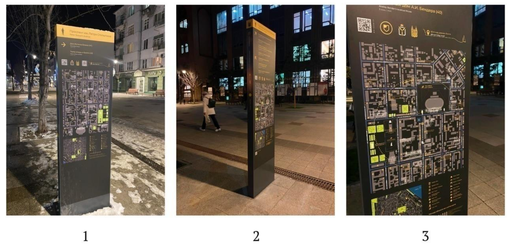 Методы исследования и материалы. Новизна представленного исследования состоит в том, что впервые предпринимается попытка выявить и описать особенности формирования национальной идентичности немцев Поволжья, репрезентированных в символическом пространстве визуальной коммуникации (на материале артефактов, этикеток, фотографий плакатов, растяжек). В работе использованы: компаративный метод исследования (сопоставление имеющихся объектов визуальной коммуникации); семиотический метод исследования (выявление особенностей символического пространства). Импульсом для написания статьи послужила, в том числе, деятельность архитектора – урбаниста А. Богнера – автора проекта «Жёлтая линия» [1; 2; 3], по инициативе которого в городе появились пилоны, содержащие подробную информацию маршрутов туристической навигации по историко-культурным и архитектурным памятникам города Саратов, в том числе и с указанием таковых на местности, где проживали русские немцы в Поволжье. Обращает на себя внимание дизайн установленных в центральных районах города пилонов – все они выполнены в едином дизайнерском формате, в котором прослеживается традиционалистская немецкая стилистика: использование, например, цветов немецкого флага, символической типографики, соблюдение канонических правил композиционного размещения информации. Обращение А. Богнера к «немецким» истоком неслучайно: именно культурное наследие немцев Поволжья по праву считается уникальной «визитной карточкой» города, в определенной мере «работает» на популяризацию туристического имиджа города Саратов [4; 11]. Последний факт свидетельствует о практической значимости исследуемой темы. Изображения пилонов архитектора А. Богнера мы приводим в статье (рис.2).
