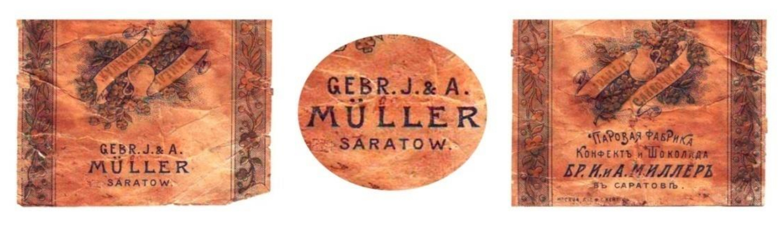 Результаты исследования. Как известно, все новое – это хорошо забытые старое, и мы задались целью найти, собрать воедино и проанализировать элементы/объекты визуальной коммуникации, которые имеют прямое или косвенное отношение к немцам в Поволжье, стилистика которых отражала уникальный этнический колорит и послужила рефлексией известных на тот период времени исторических реалий. Нам удалось выявить около 30 объектов, включая элементы, представленные в виде фотографий. Собранный материал был классифицирован на 2 группы по принципу своего смыслового назначения. К I-й группе относятся этикетки, артефакты – объекты визуальной коммуникации, связанные с презентацией предприятий русских немцев в Поволжье и имеющие семантику рекламирования. Среди них паровая фабрика «Конфект и Шоколада Бр. И. и А. Миллер», фабрика по выпуску гильз «Фортуна» (бывшая Вааг), Сарпино-ткацкое производство. Паровая фабрика «Конфект и Шоколада Бр. И. и А. Миллер» (братьев Иоганна и Андреаса Миллер) начала функционировать в 1903 г. В большом ассортименте производился мармелад, пастила, монпасье, зефир, десертный шоколад. Через 10 лет, после революции в здании располагалась типография, а затем - швейная фабрика. В настоящее время на месте бывшей кондитерской фабрики Бр. И. и А. Миллера на улице Астраханской отшиваются качественные изделия от школьной формы до стильных пальто. Этикетки продукции фабрики Бр. И. и А. Миллер производили благоприятное впечатление – кондитерские изделия хотелось купить. Причем сохранились не только этикетки, но и артефакты – металлические коробки, в которых продавались конфеты (рис. 4, крайняя слева). Первое, что следует отметить – это то, что в художественном оформлении прослеживается большая привязанность к родному краю (на многих изображениях стилистика деревенской пасторали, птицы, флористические мотивы, «деревянное кружево», которым украшались деревенские дома, в том числе в немецких поселениях. Как мы предполагаем, этикетки, которые вкладывались непосредственно в коробки, носили более лаконичный характер: (рис. Черно-белые Миллер) черный цвет шрифта и использование фрактуры в готическом стиле (отсылка к традиции «черного искусства» Иоганна Гутенберга) использование разрядки букв, характерные рамки, которые задают канонические законы композиции и в тоже время присутствие на изображении изразцов, вензелей. На обертке сливочной карамели еще можно увидеть и подпись на немецком языке (Gebr. Miller (Gebrüder Miller – братья Миллер)) (рис. 3).