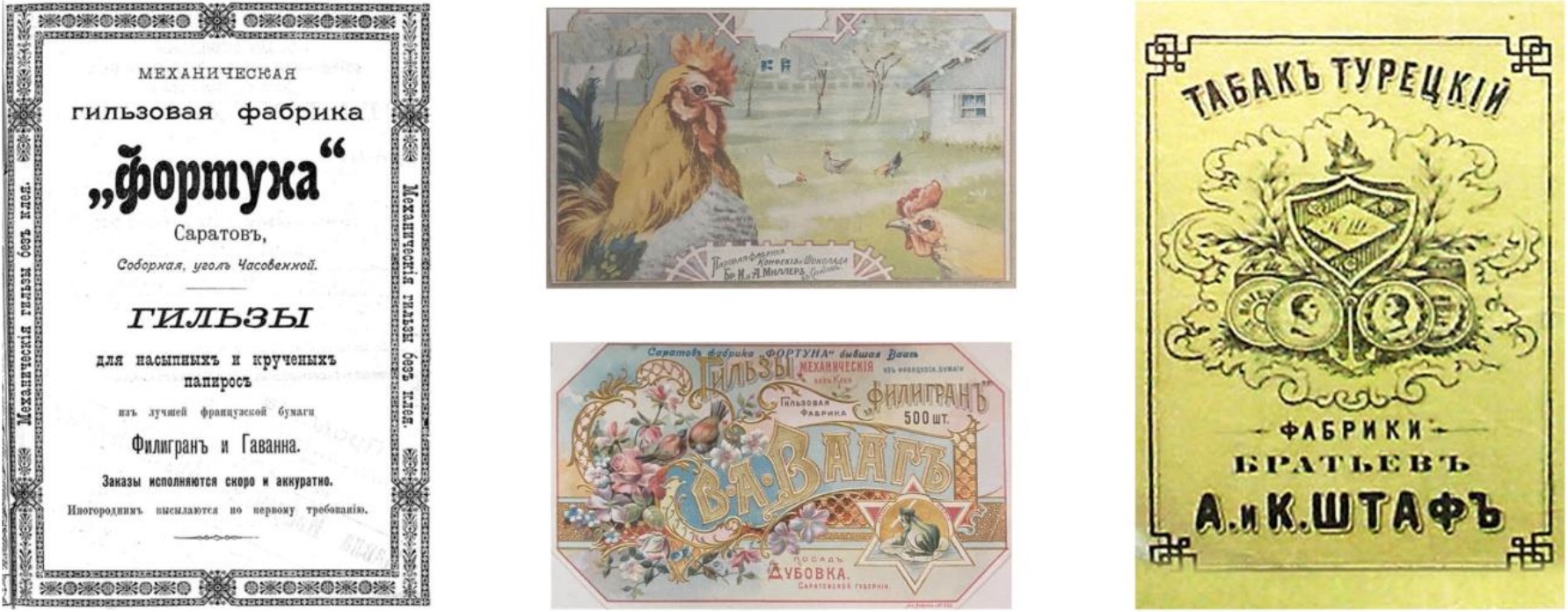 Возвращаясь к теме табачного производства в Саратове, необходимо упомянуть и табачную фабрику братьев Кондратия и Михаила Штаф, которая начала функционировать 6 декабря 1828 г. Здание фабрики по сей день, причудливо украшает городской пейзаж и вплоть до 2019 г. «Бритиш Американ Тобакко (БАТ) Россия» являясь крупнейшим налогоплательщиком, занималась производством табачной продукции (ушли с рынка в связи с ростом цен на табачные изделия, падением потребительского спроса, ростом нелегального сбыта). Отметим также, что впервые табак был завезен в Поволжье переселенцами из Голландии, культура получила быстрое распространение. Первоначально табак производился для внутреннего использования, затем продавался кочевавшим неподалеку калмыкам, а с течением времени табачные изделия стали производится на первой фабрике в поселении Сарепта [8] (небольшое, единственное на то время предприятие на юге Поволжья). Однако, «табачный вопрос» тема отдельного исследования, и мы не будем останавливаться на ней здесь подробно. Как видно по размещенным в статье фотографиям, дизайнерская стилистика имеет сходные черты (рис.5 (3), рис.5 (4): сбалансированная композиция, черный цвет шрифт на светлом фоне, разрядка букв, разные шрифты, рамка с декоративными элементами, флористические мотивы.