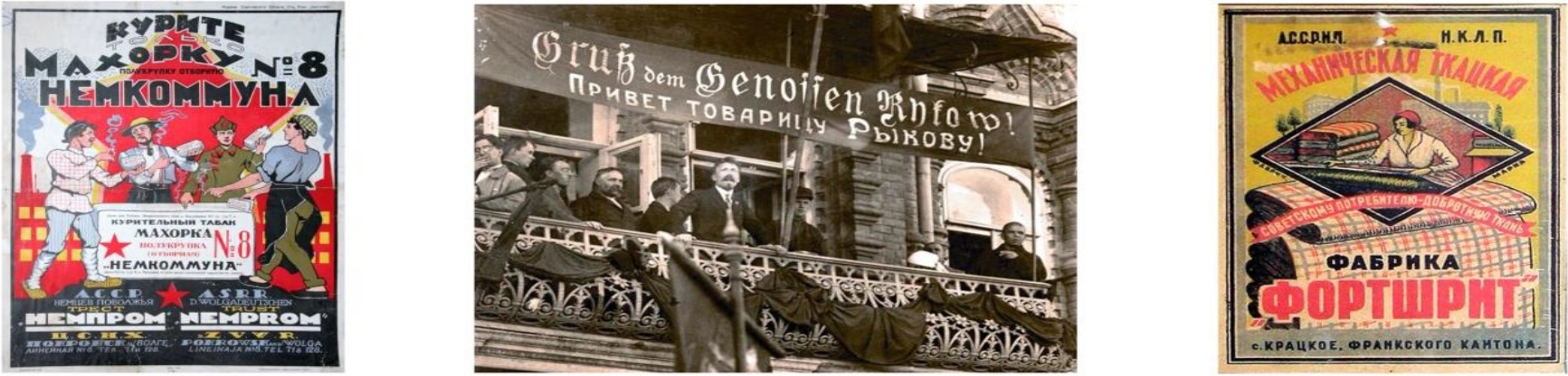Рис. 6 (1). Плакат с пропагандой курения махорки №8 (Shag propaganda poster №8) Рис. 6 (2). Растяжка с приветствием политического деятеля товарища Рыкова (Streamer greeting political figure Comrade Rykov) Рис. 6 (3). Этикетка механической ткацкой фабрики «Фортшрит» (Label of the mechanical weaving factory "Fortshrit")