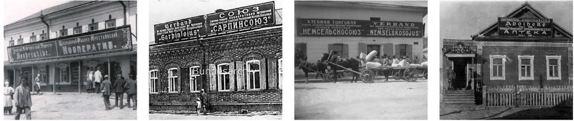Рис. 7 (1). Немецкий рабоче-крестьянский кооператив (German workers’ and peasants’ cooperative) Рис. 7 (2). Голо-Карамышский союз ткацких кооперативов и трудовых артелей «Сарпинсоюз» (Go-lo-Karamysh’s union of weaving cooperatives and labor artels «Sarpinsoyuz») Рис. 7 (3). Союз сельскохозяйственной кооперации немцев Поволжья Немсельcкocоюз (хлебная торговля) (Agricultural cooperation union of the Volga Germans Nemselskosoyuz (grain trade)) Рис. 7 (4). Аптека (Chemist’s)
