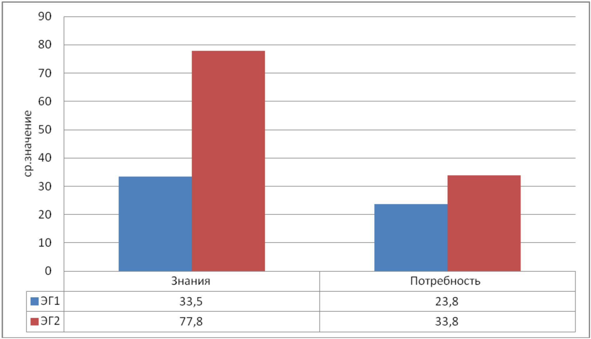 Результаты исследования информационно-потребностного критерия готовности при помощи авторского теста «Самоконтроль знаний о здоровье и здоровьесберегающей деятельности в хореографии» показали, что знания выше у студентов ЭГ 2 – средний балл в их группе 77,8, тогда как у студентов ЭГ 1– 33,5 балла.