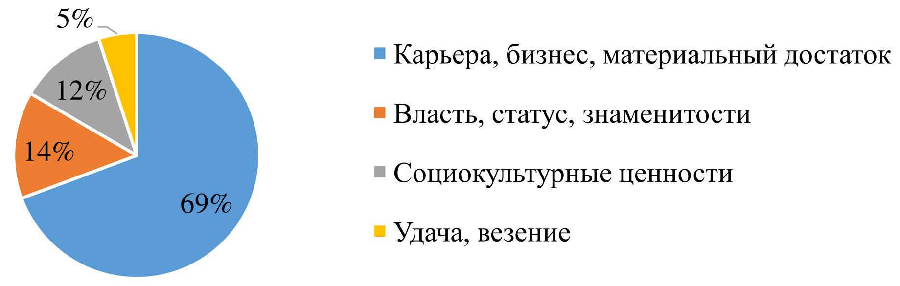 Введение. Исследование феномена успеха носит междисциплинарный характер, являясь объектом изучения различных гуманитарных наук, в частности философии, социологии, культурологии, психологии. Следует отметить, что социокультурное и психологическое понимание понятия «успех» имеет сложную и многогранную структуру. «С одной стороны, успех рассматривается как индикатор переживания индивидом результата собственных действий и усилий, а с другой как показатель своеобразия его положения среди других людей и, следовательно, специфики его социальных связей и отношений» [1, с. 3]. В настоящее время исследование успеха приобретает особую актуальность, представляя интерес с точки зрения раскрытия ценностных оснований как отдельной личности, так и общества в целом.