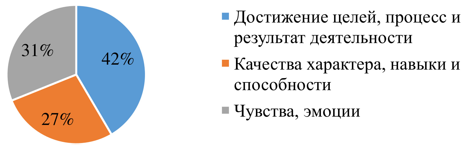 Диаграмма соотношения используемой лексики в наиболее высокочастотных категориях «внутреннего» успеха представлена на рисунке 3. На графике видно, что успех в подавляющем большинстве отражает такие качества, как целеустремленность, мотивацию на достижение результатов, эффективное выполнение задач. Это коррелирует с определением содержания «внутреннего успеха» в современных исследованиях в области психологии, как достижения значимых для человека целей.
