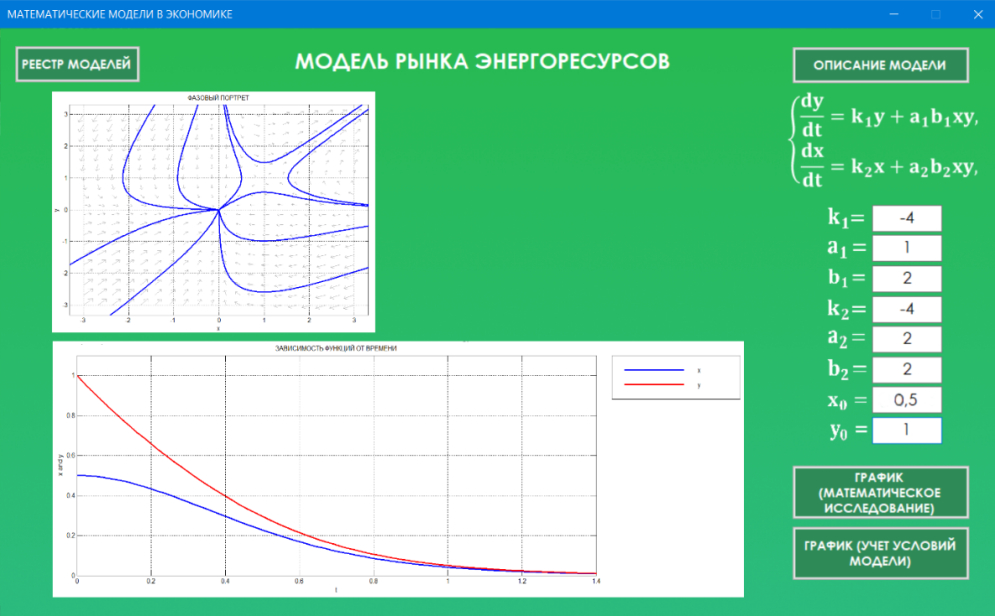 Результаты исследования. Разработан цифровой ресурс «Математические модели в экономике» (программный комплекс), который состоит из четырех разделов. Каждый из разделов связан с конкретной математической моделью из области экономики: модель экономического цикла Филлипса, модель спроса и предложения, модель рынка энергоресурсов, модель инфляционных ожиданий. Например, окно с моделью рынка энергоресурсов выглядит следующим образом (рис. 1):